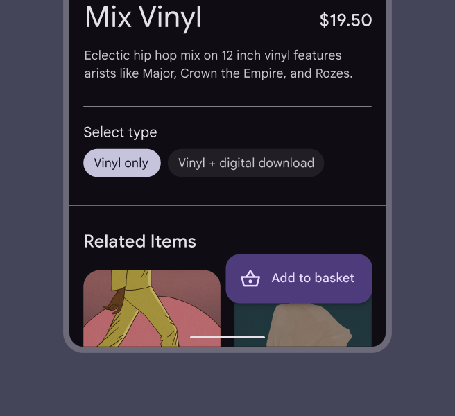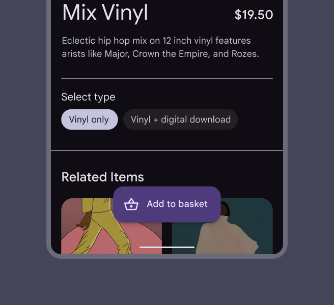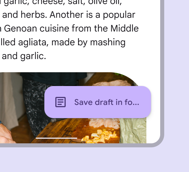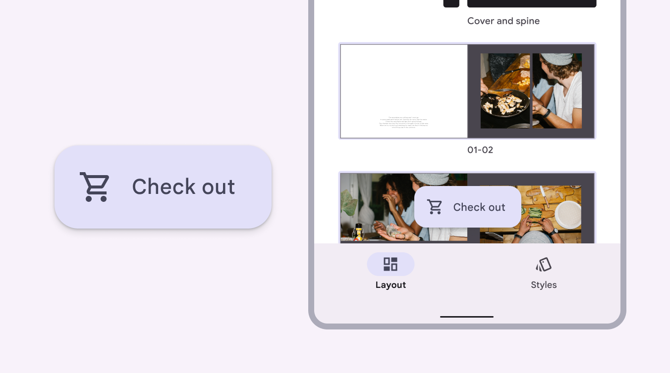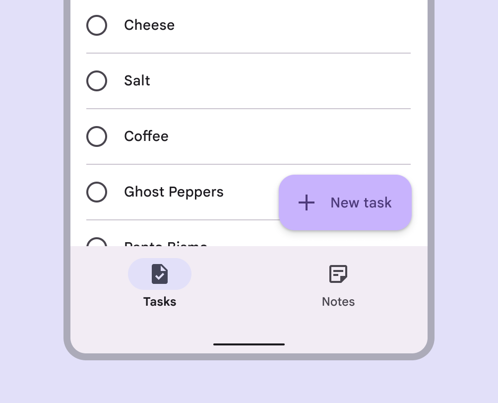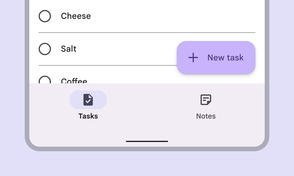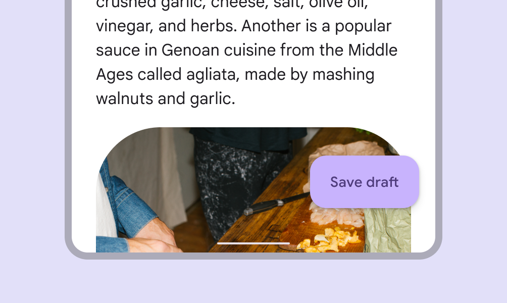 - 擴充套件 FAB 的文字標籤應該清晰描述操作,例如“儲存草稿”或“新增到購物車”。