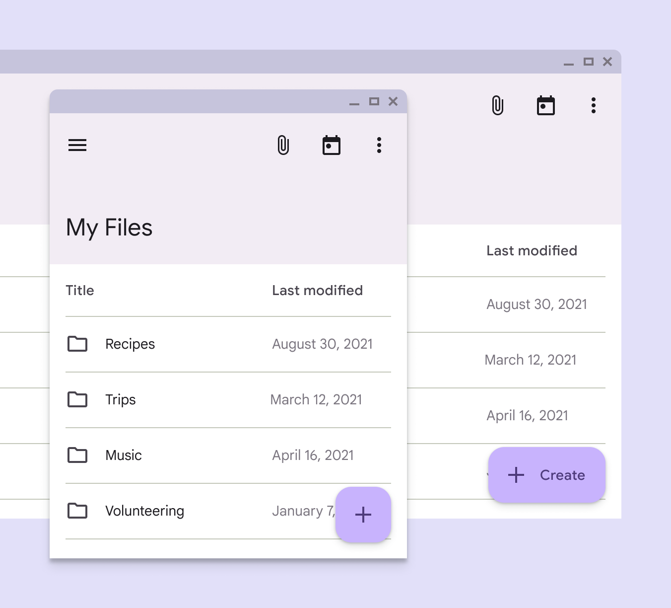 在大螢幕上,擴充套件 FAB 需調整位置以適應多列布局。在緊湊模式下,FAB 會收縮為普通形態。桌面端:FAB 位於側邊欄或右下角。移動端:FAB 根據螢幕大小自適應