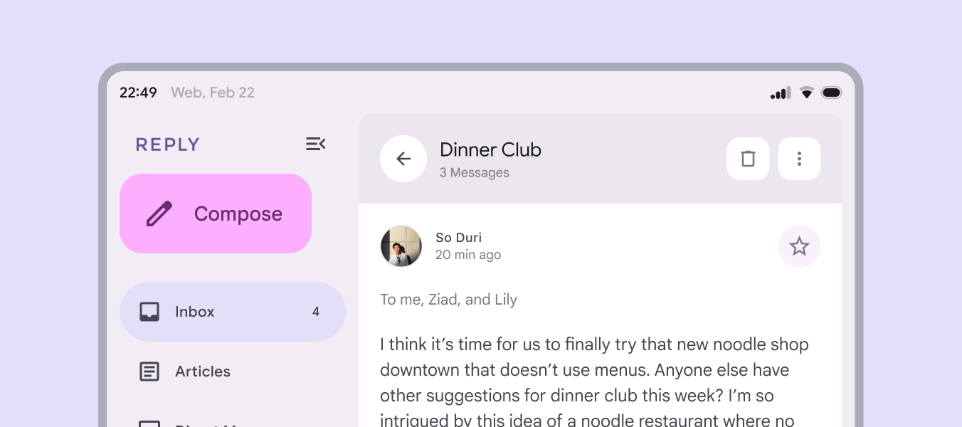 在擴充套件模式下,FAB 可能需要額外的空間,例如在對話介面或郵件撰寫介面中。這類場景下,FAB 可能包含更多文字或額外的操作選項。