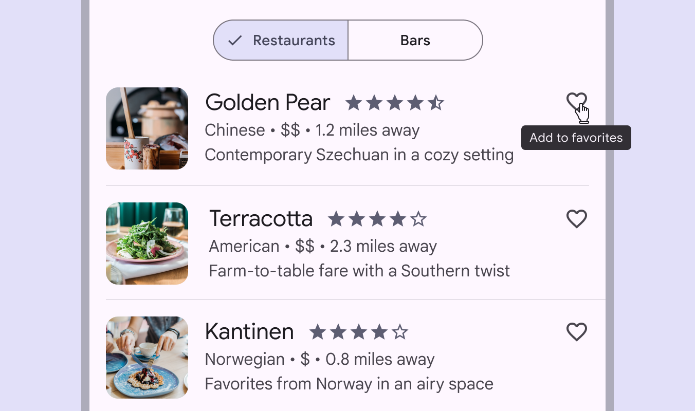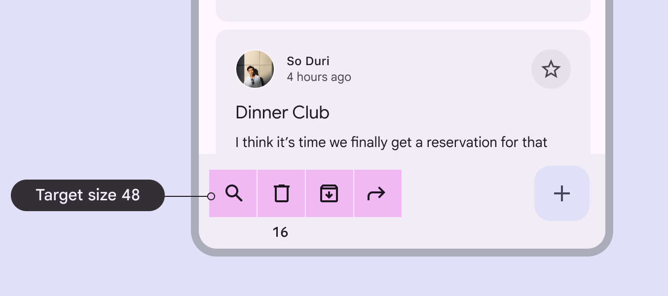 你可以把多個圖示按鈕放在一起使用,也可以單獨使用一個按鈕。為了讓使用者能夠輕鬆準確地點選到按鈕,每個圖示按鈕的可點選區域要有48dp那麼大。