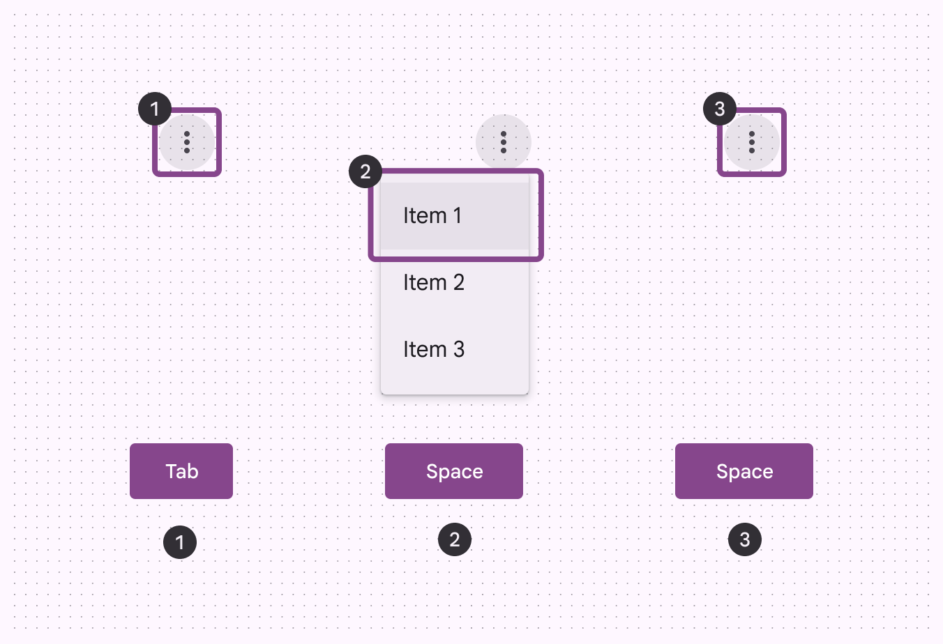 選單相對於螢幕或瀏覽器的邊緣定位。它們通常出現在生成它們的元素的下方、旁邊(或前面)。如果它們的位置可能被瀏覽器或螢幕邊緣截斷,選單可以改為出現在生成它的元素的左側、右側或上方。