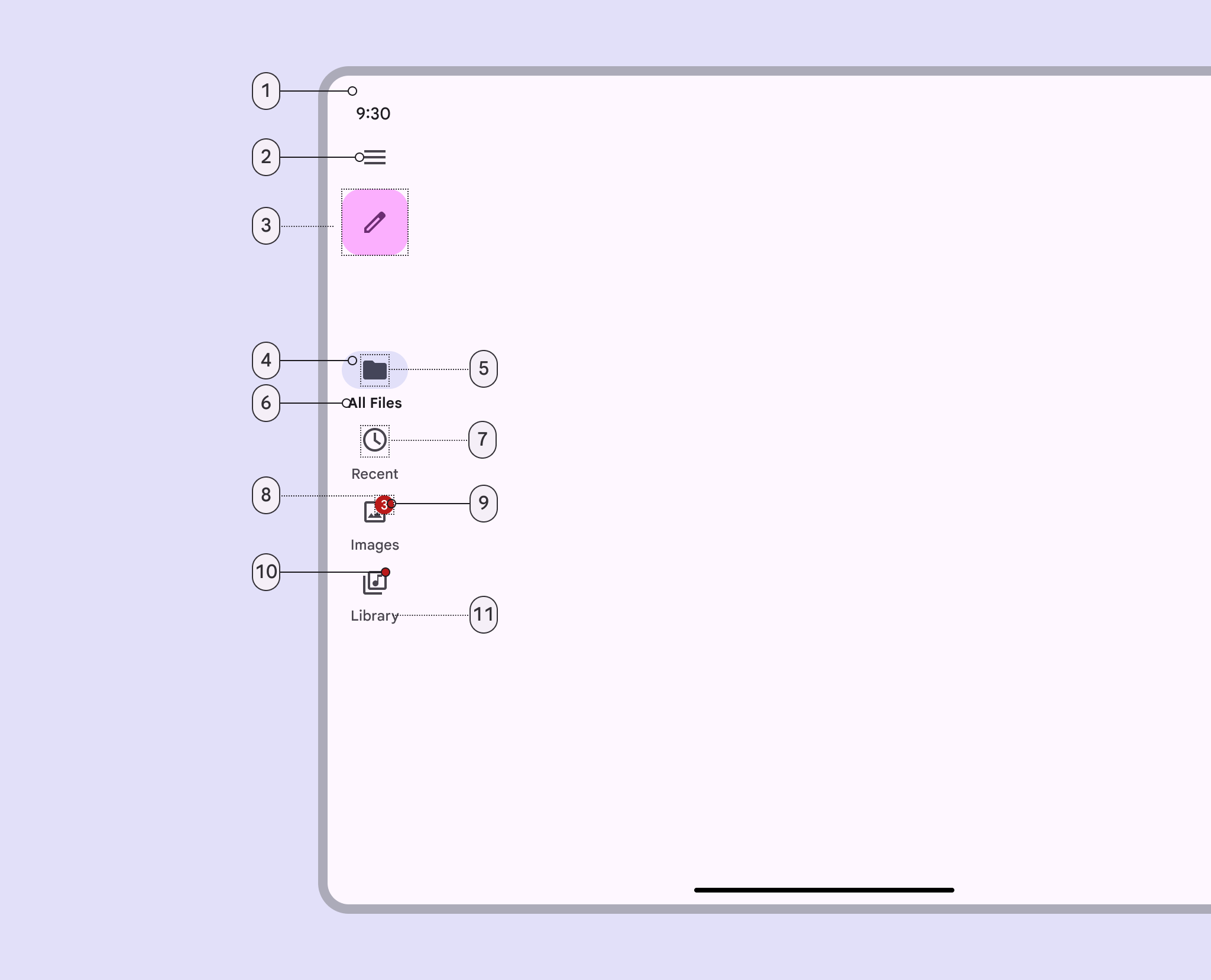 側邊欄為將 FAB 固定在螢幕頂部提供了一個方便的容器,將應用程式的關鍵操作置於導航目的地之上。當巢狀在另一個元件(如導航側邊欄)內時,FAB 的靜止高度處於 0 級。