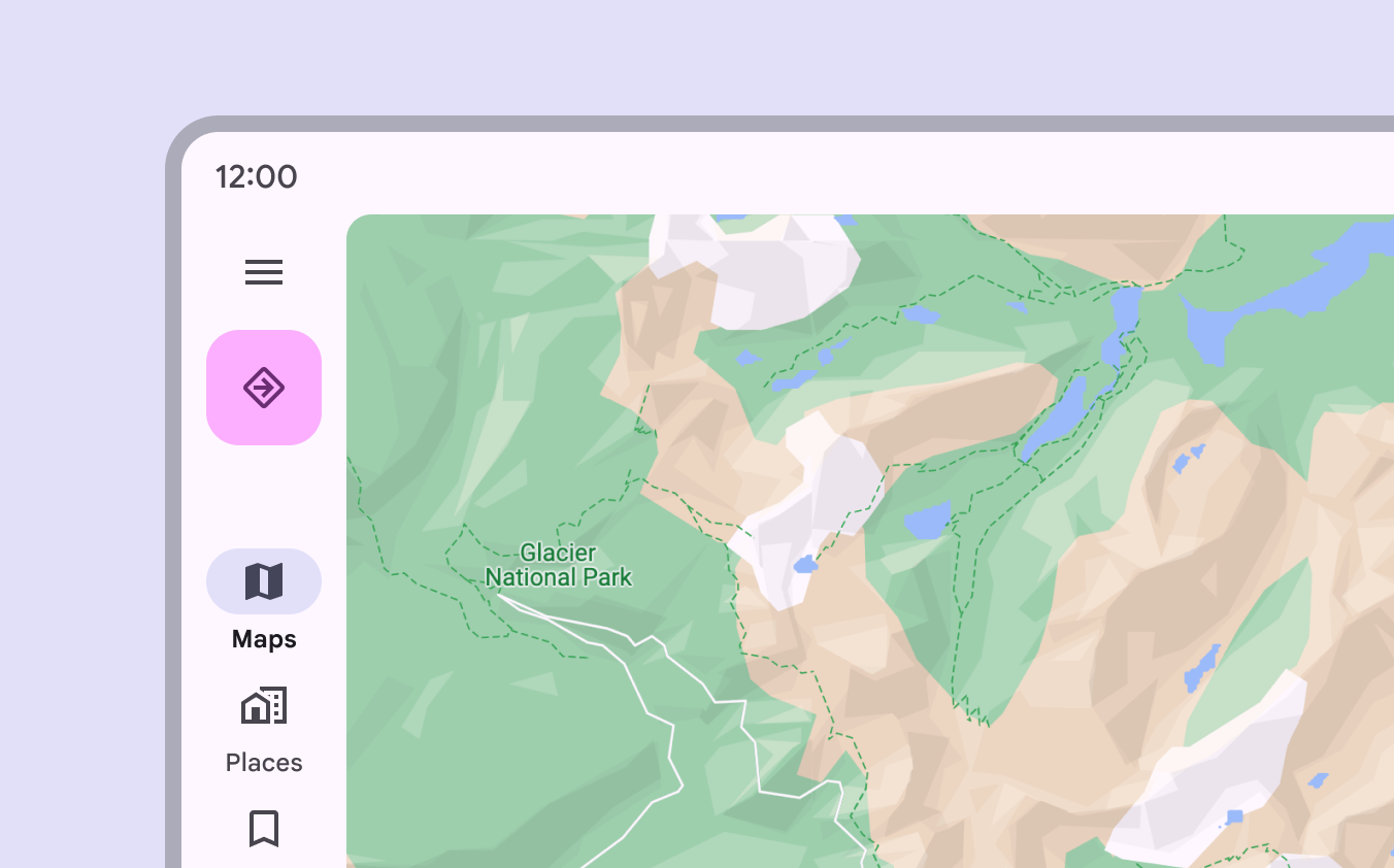 導航欄目的地可以作為一個組在佈局的頂部、底部或中心對齊。在平板電腦上,底部對齊可以使使用者更容易用拇指觸及目的地。選單和 FAB 應始終與導航欄的頂部對齊。