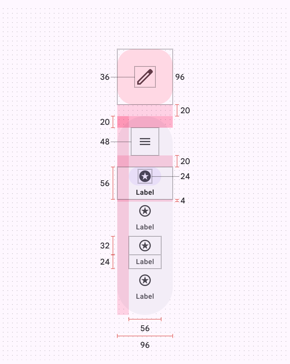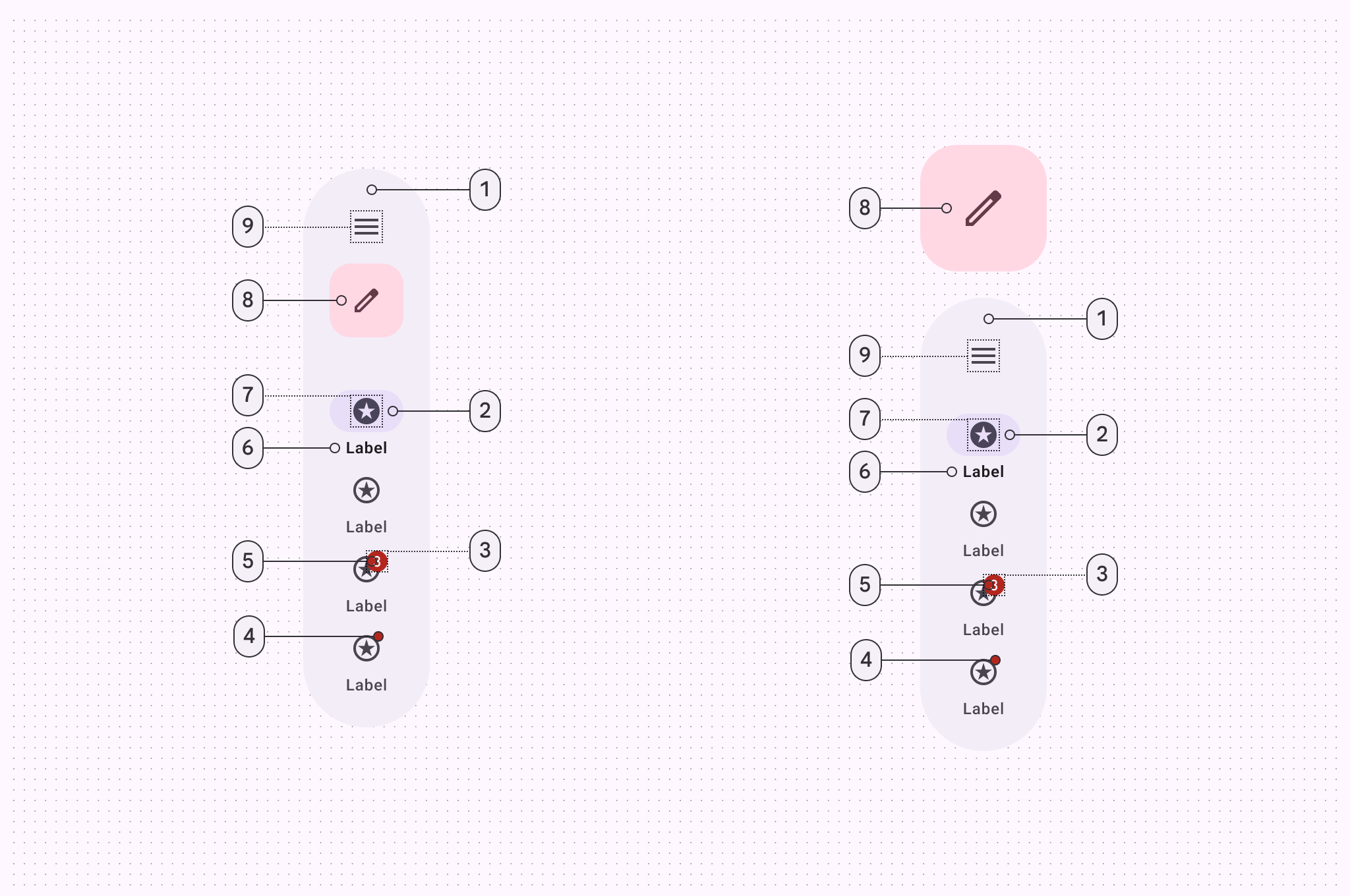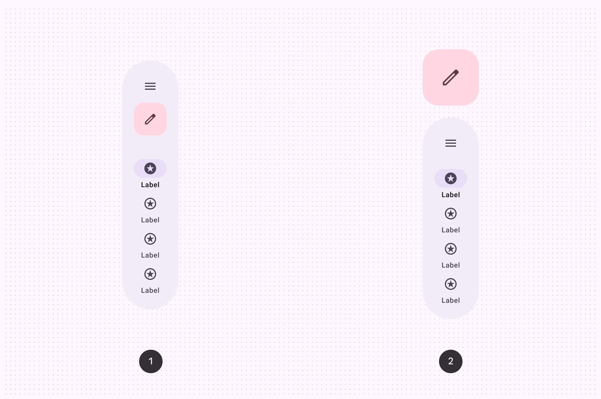 導航欄軌道器有兩種型別:內含式懸浮操作按鈕(FAB)欄和空間式懸浮操作按鈕(FAB)欄。