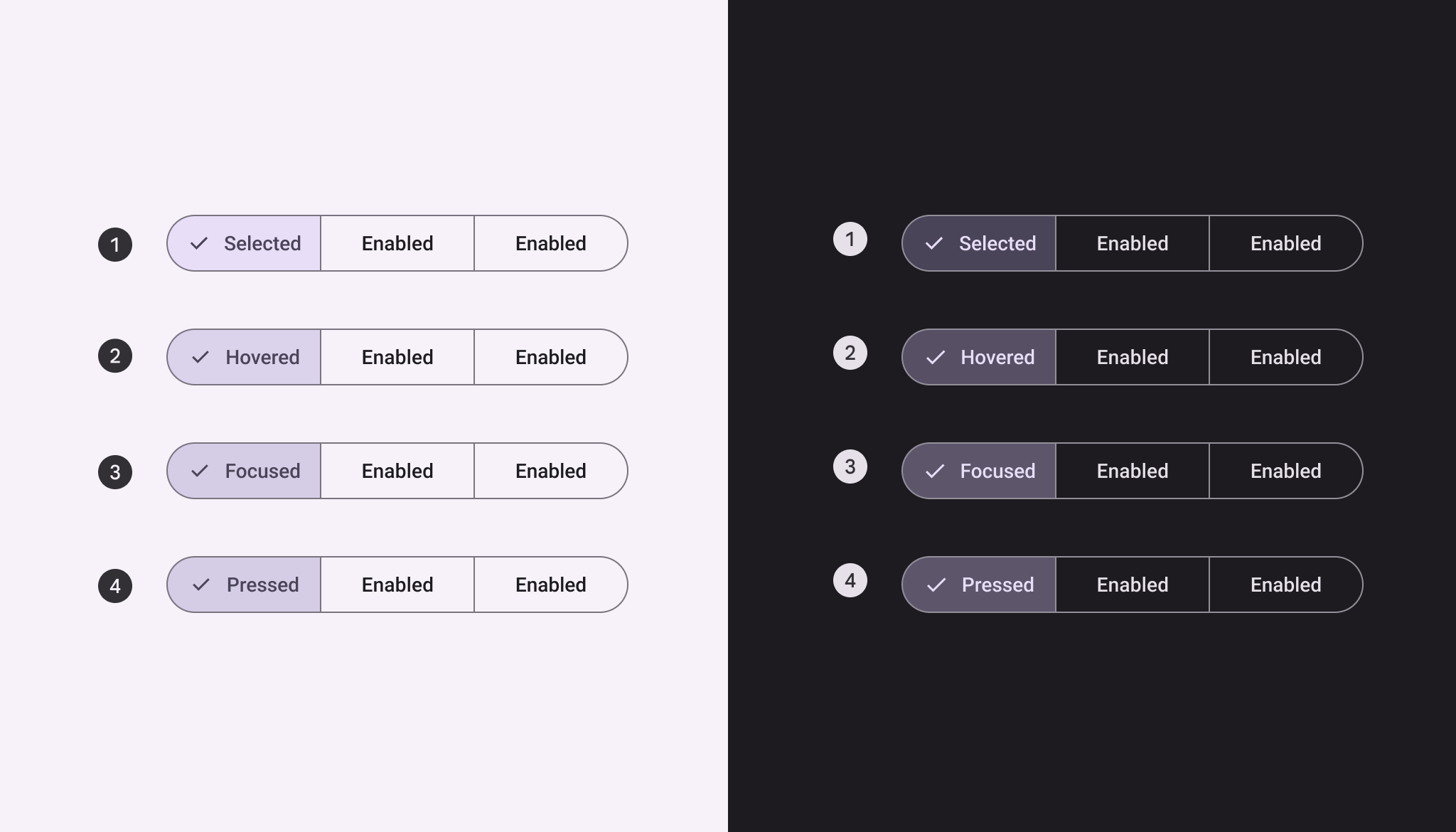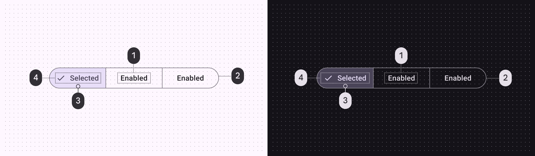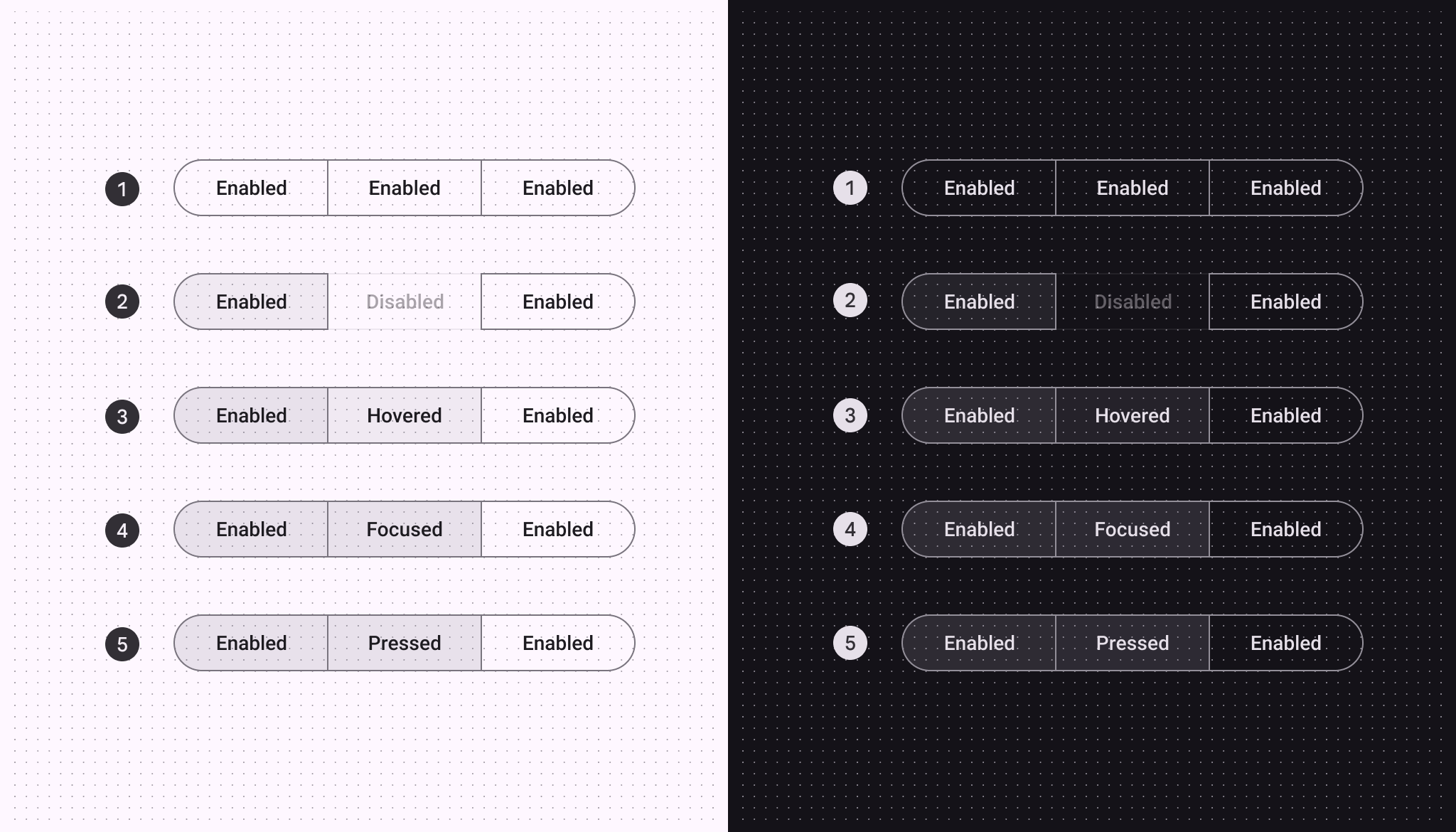 分段按鈕的顏色由設計令牌(Design Tokens)控制,以確保在淺色模式和深色模式下都能正確顯示。