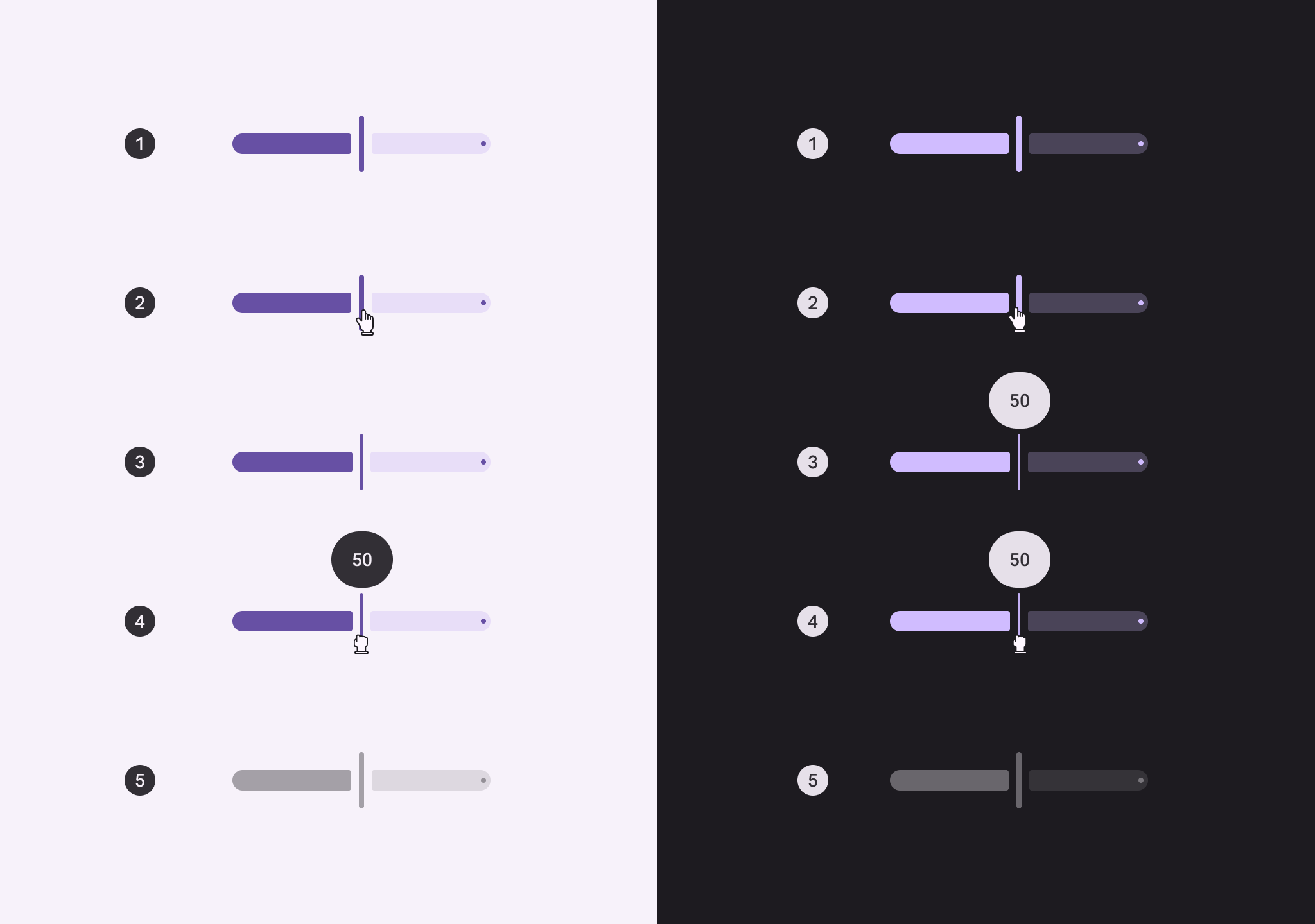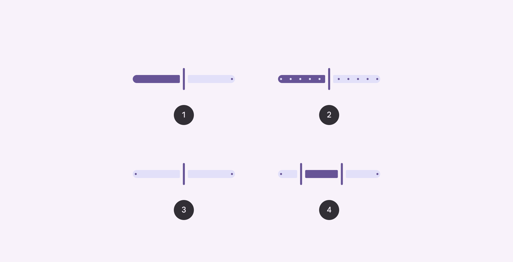 離散滑塊會捕捉到預定義的值,這些值用停止指示器標記。滑塊可以是連續的或離散的。離散模組具備停止指示器