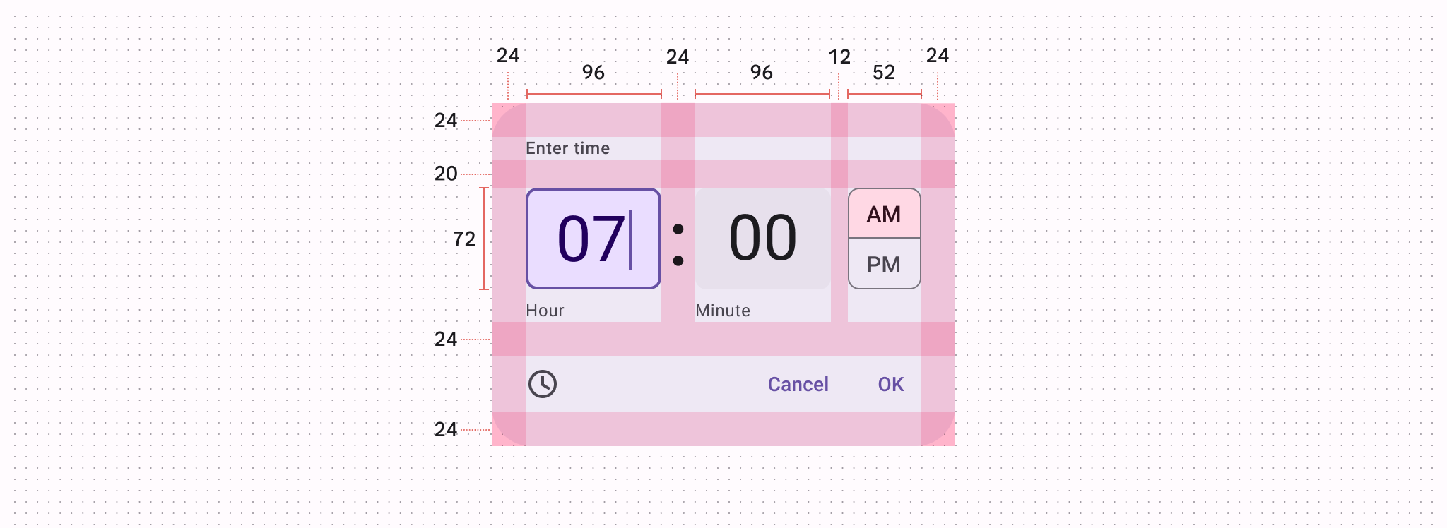 | Time input field container時間輸入欄位容器 | Width 寬度 | 96dp |