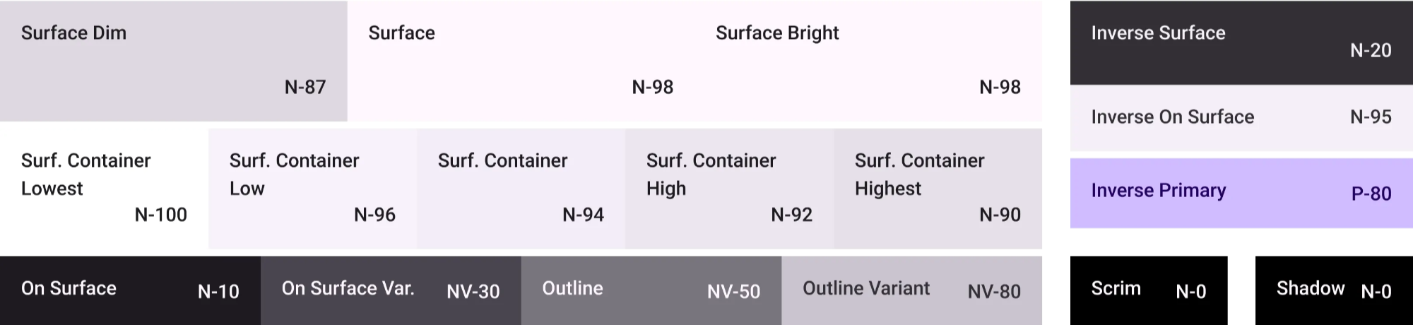 - Surface(表面色) - 用於介面背景,使 UI 結構清晰,通常是不同層級的灰色調。