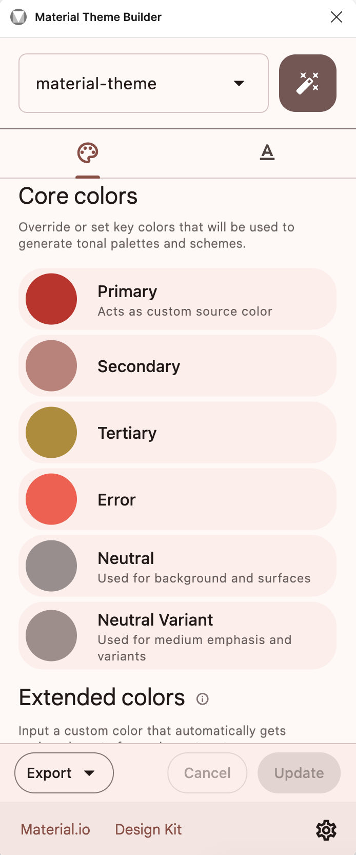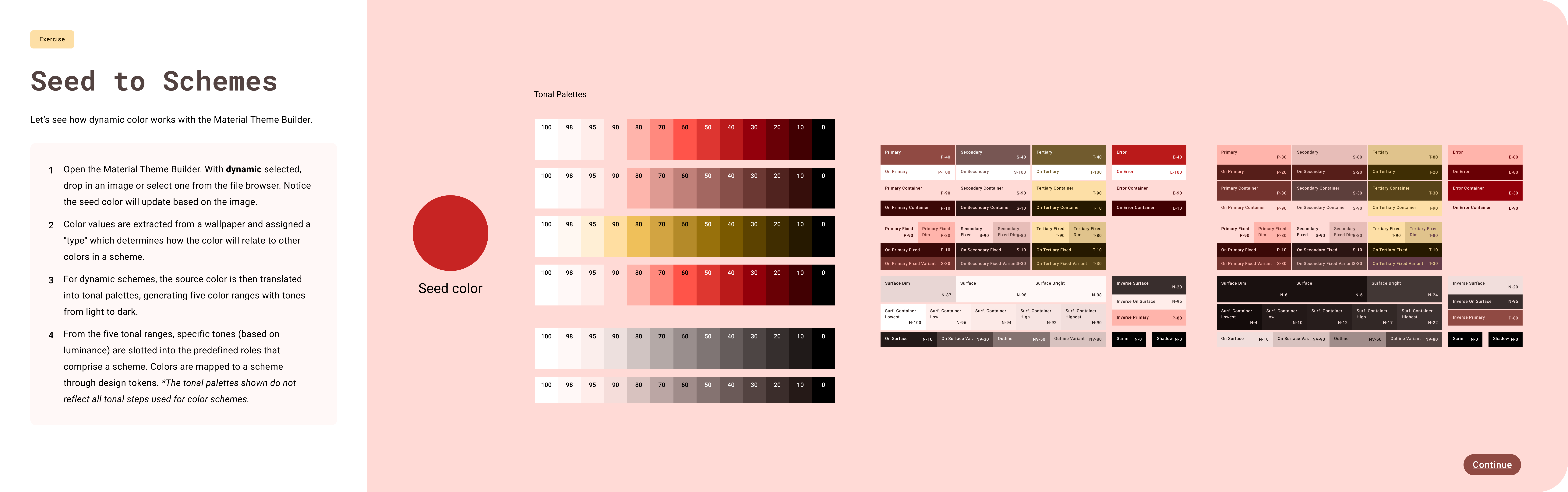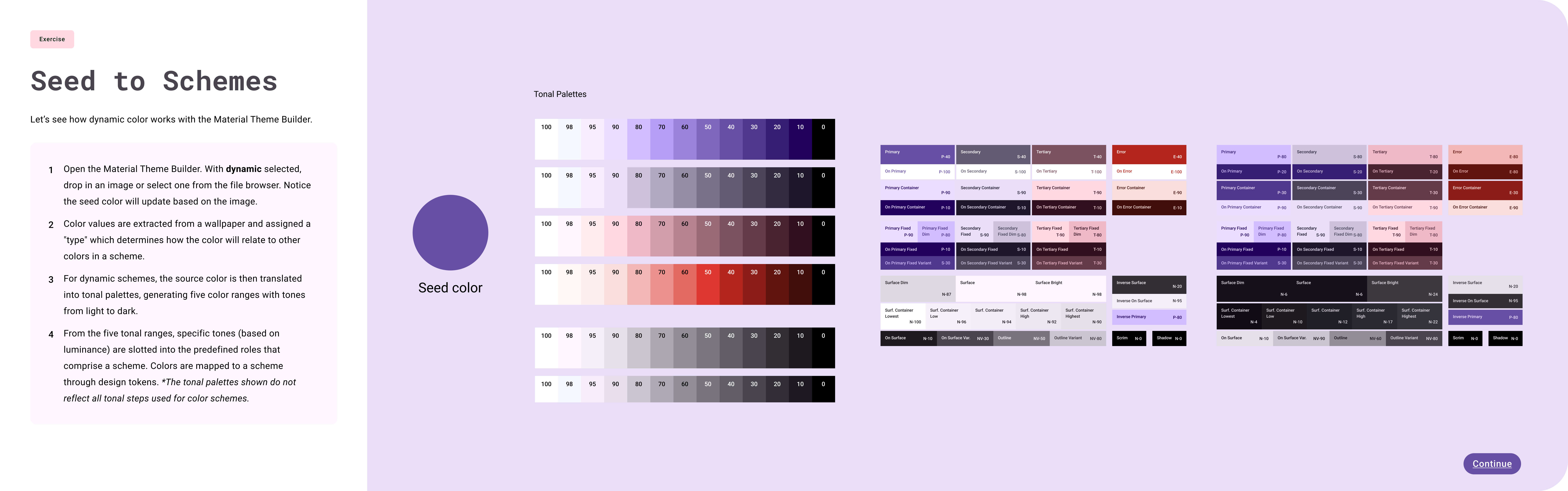 Tonal palettes 色調板:將一種色相(提取的活力色)轉換為一系列相關色調,生成十三種色調的色調板。這些色調可用於從單個元件元素到整個應用主題的各種場景。利用亮度進行設計能打造出更具易用性的調色盤。