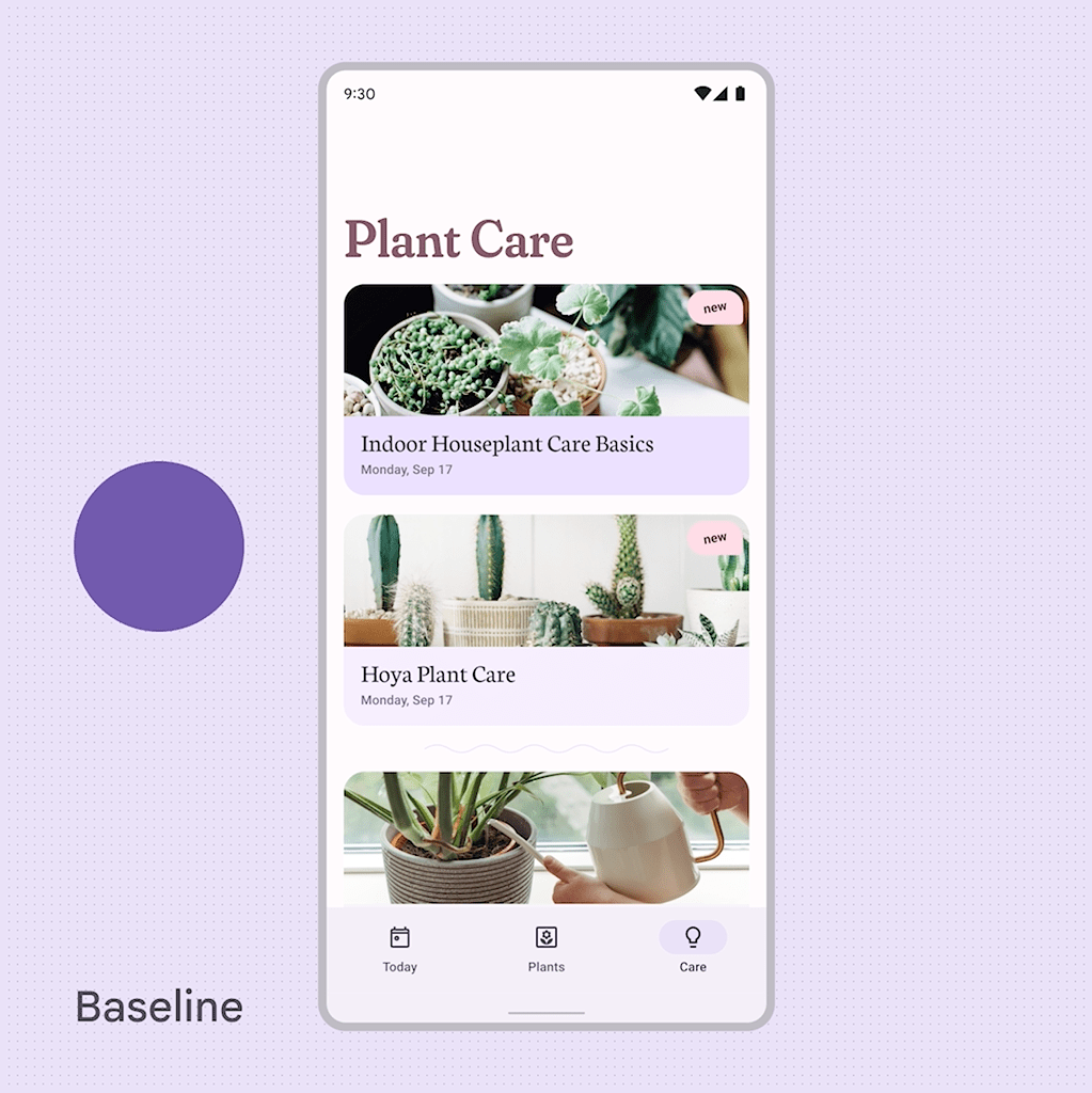 使用自定義主題可確保你的應用程式為未啟用動態顏色的使用者提供備用配色方案。