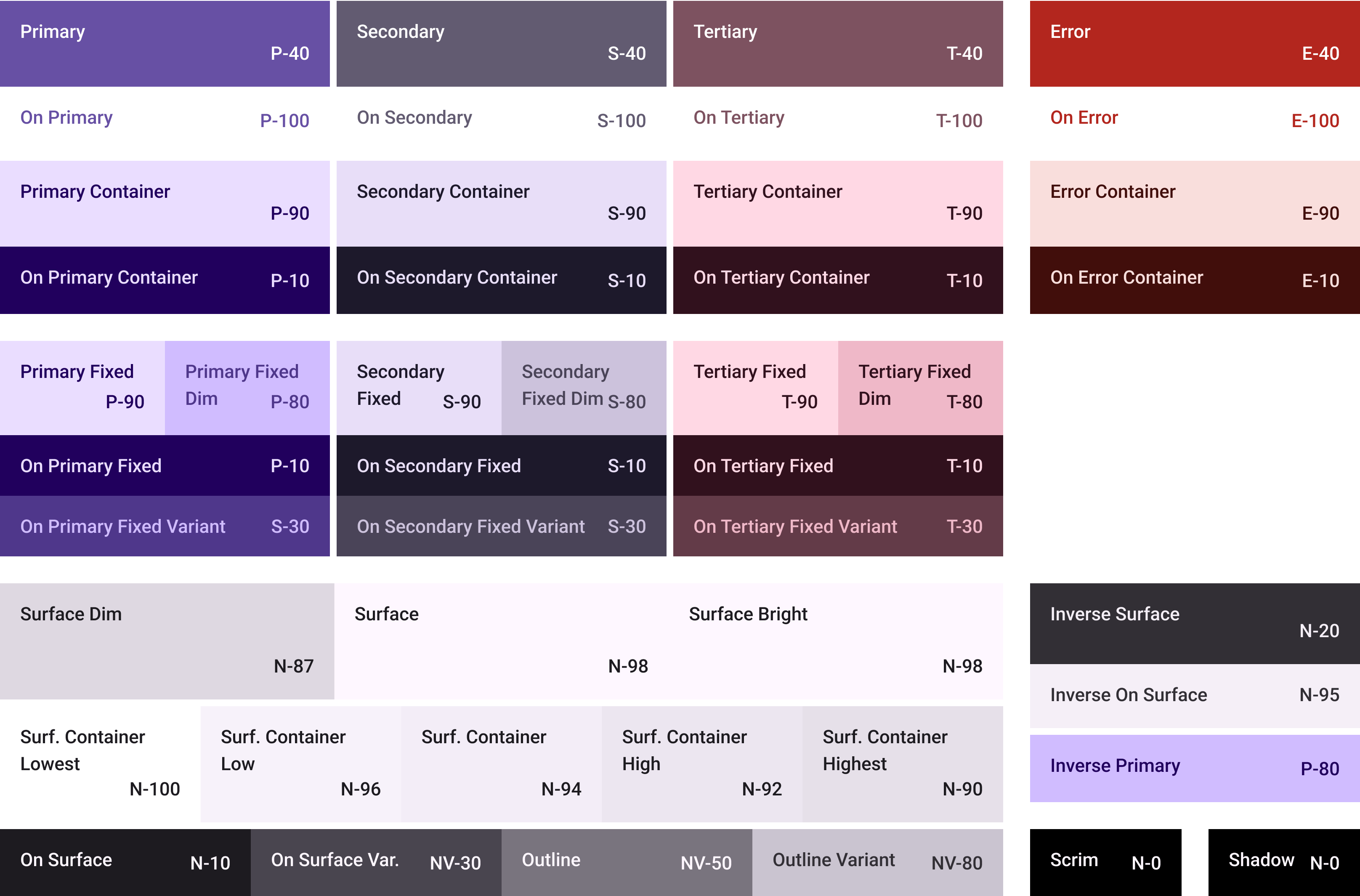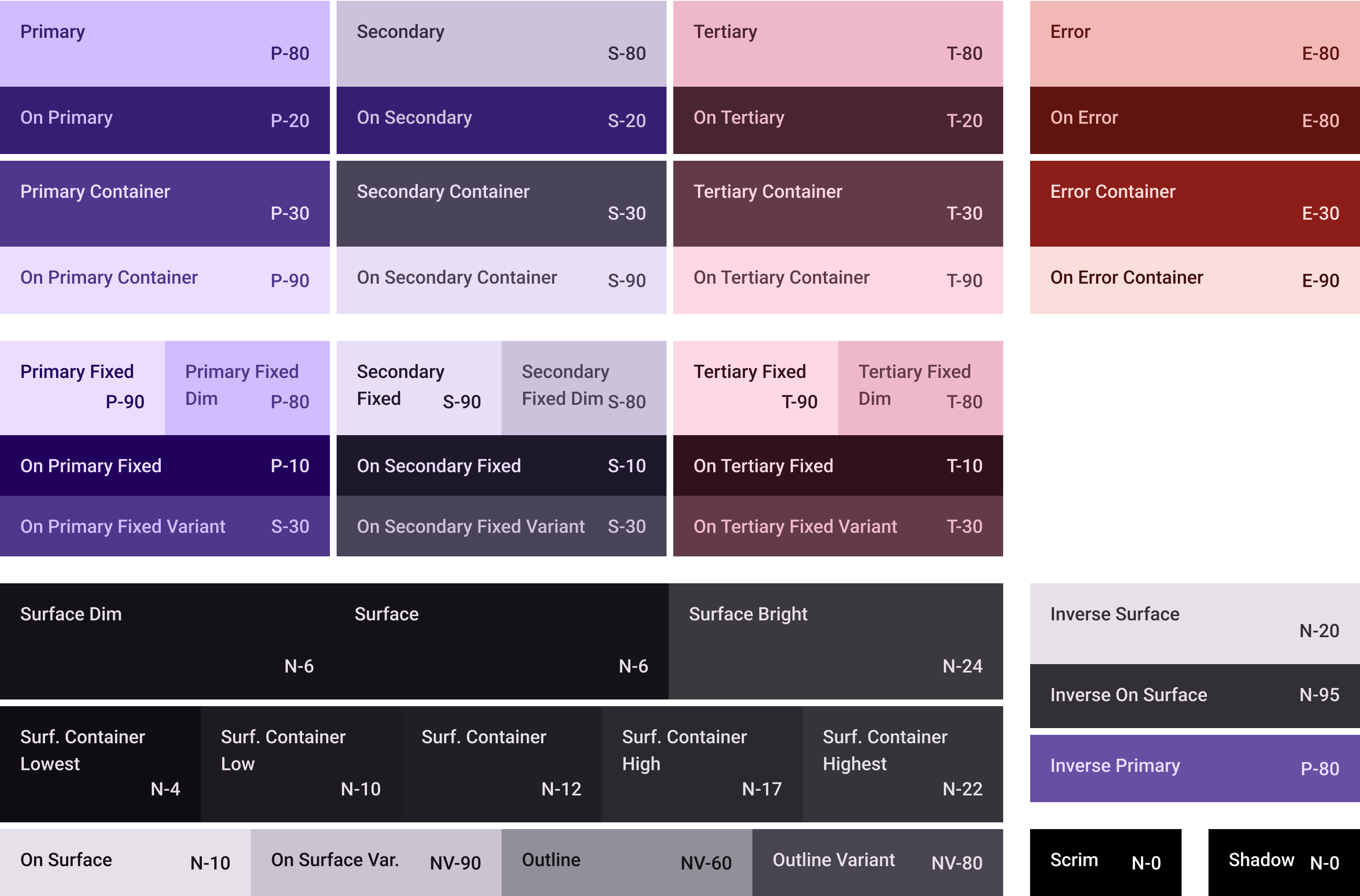 Primary Fixed、Secondary Fixed表示該顏色不會隨主題模式變化,確保一致性。例子: 在某些品牌色應用場景中,為了保持一致性,可以用