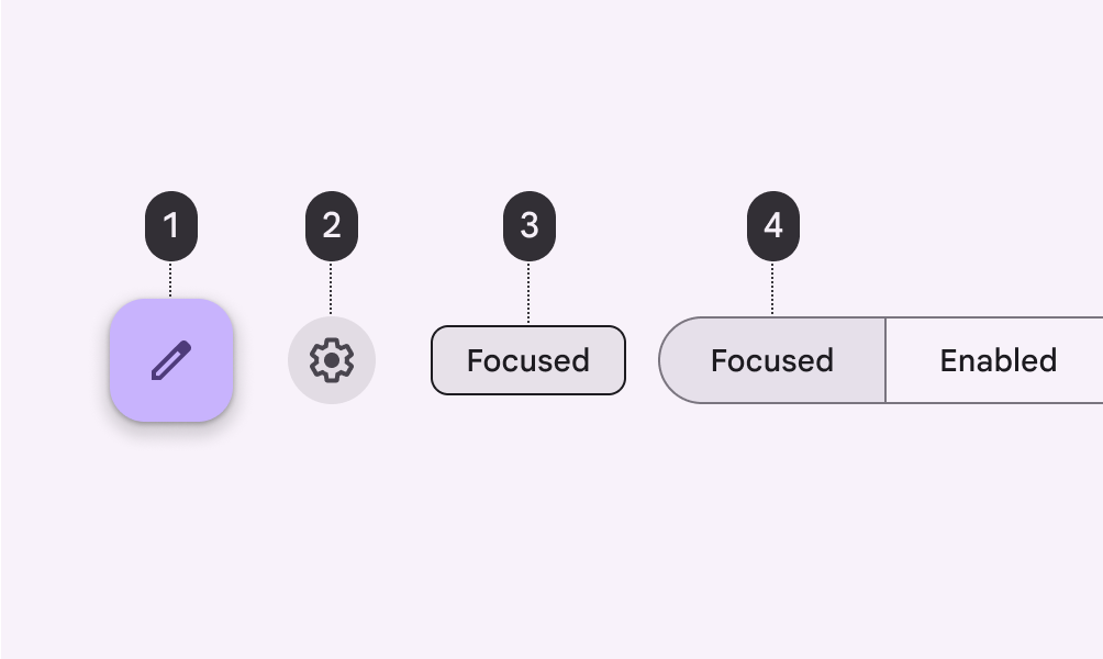 當使用者使用鍵盤或語音突出顯示某個元素時,就會呈現出聚焦狀態。聚焦狀態適用於所有互動元件。聚焦狀態下高強排程的表面覆蓋層可應用於整個元件、元件內的元素,或者以圓形覆蓋在元件的部分割槽域上。