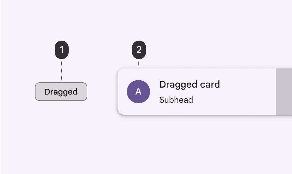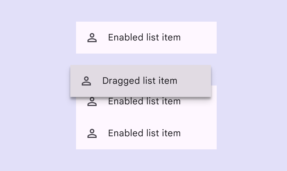 拖動狀態在使用者按下並移動元素時出現,使用較低強排程的覆蓋層以減少視覺干擾。覆蓋層可應用於整個元件或其內部元素,某些元件(如列表項、標籤、卡片)可透過高程變化來顯示拖動狀態。