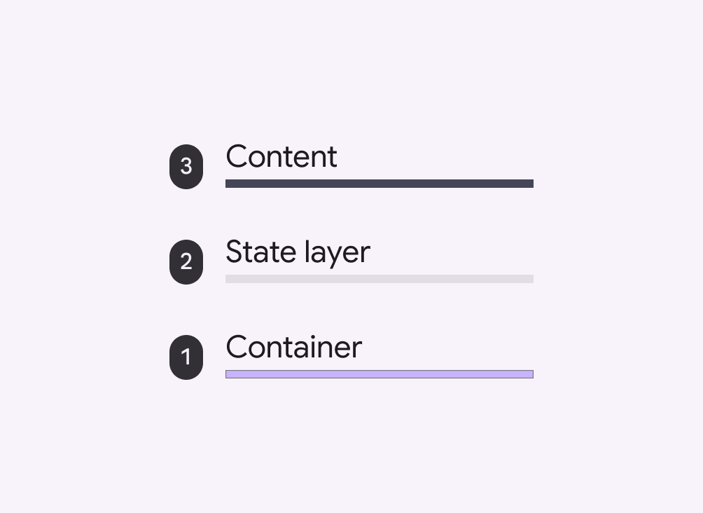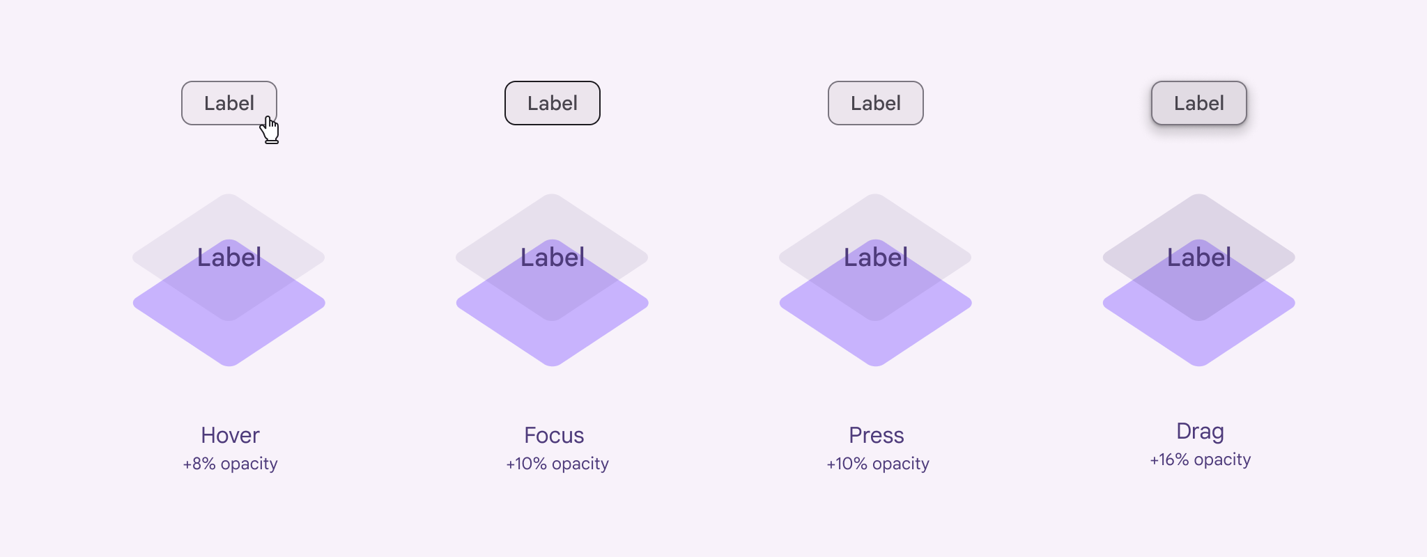 狀態層使用固定的不透明度百分比和內容顏色(通常是開啟狀態的顏色)來顯示不同狀態。