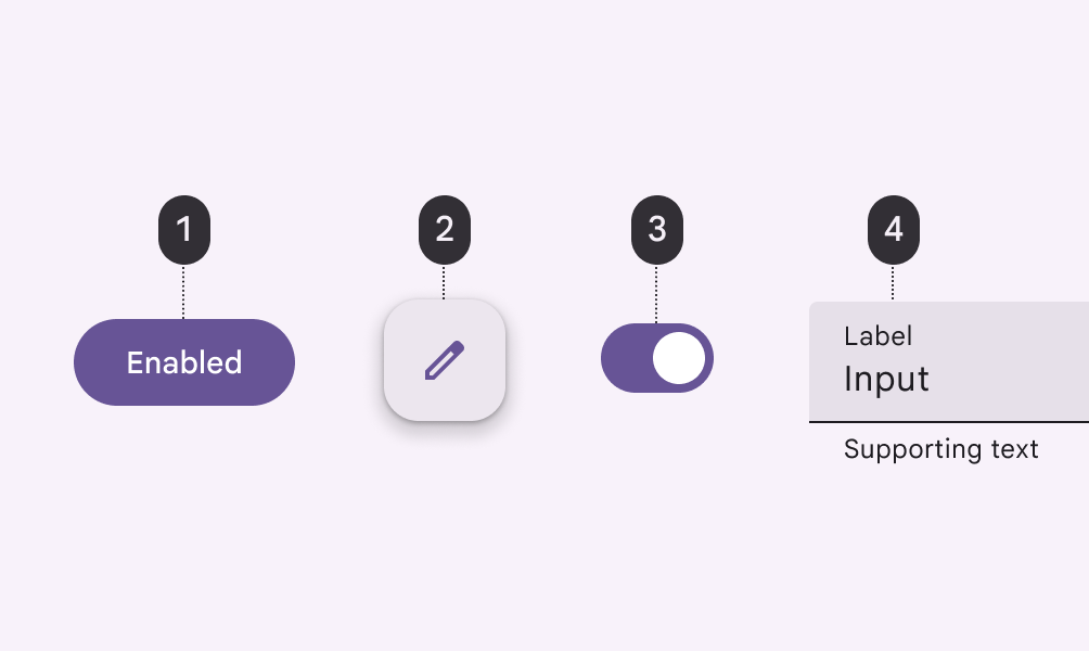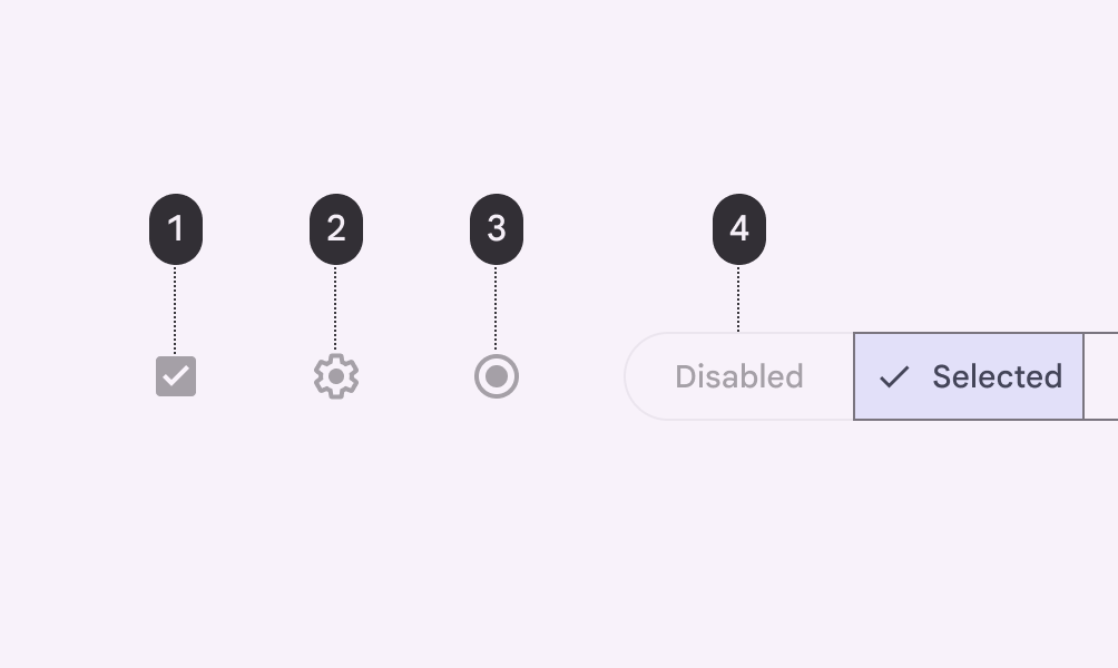- 選擇控制元件(Selection Controls) – 例如單選按鈕、滑動開關等會顯示選中狀態。
