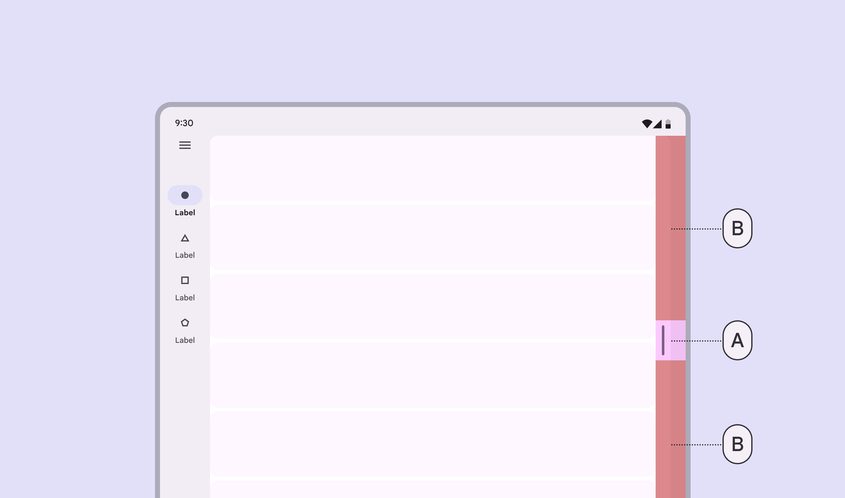 拖動手柄的觸控區域(Touch Region A)優先順序高於系統返回手勢(Back Gesture B),確保使用者可以正確拖拽面板,而不會誤觸返回操作。