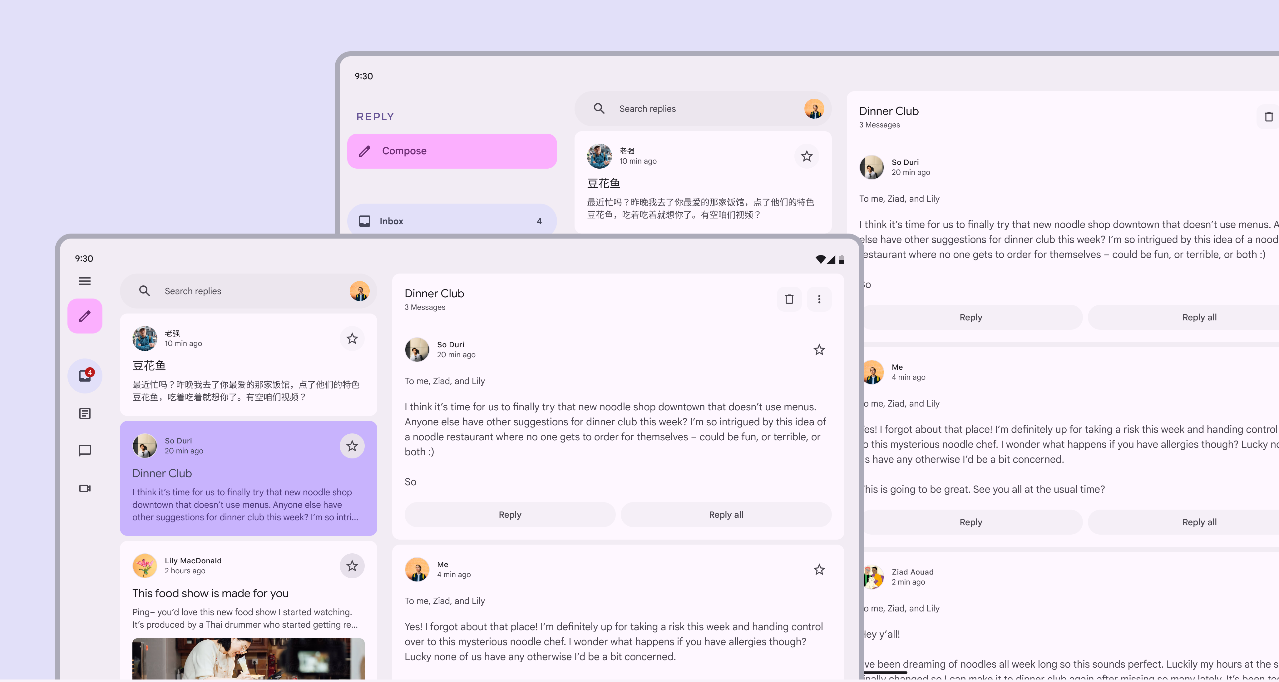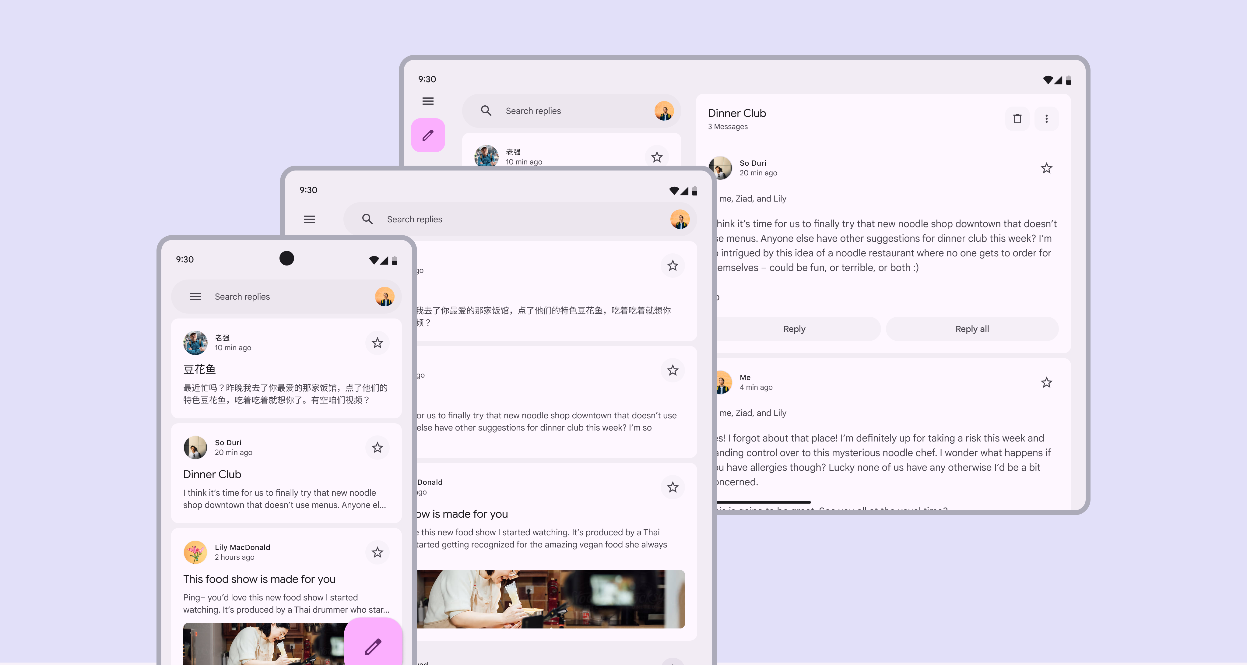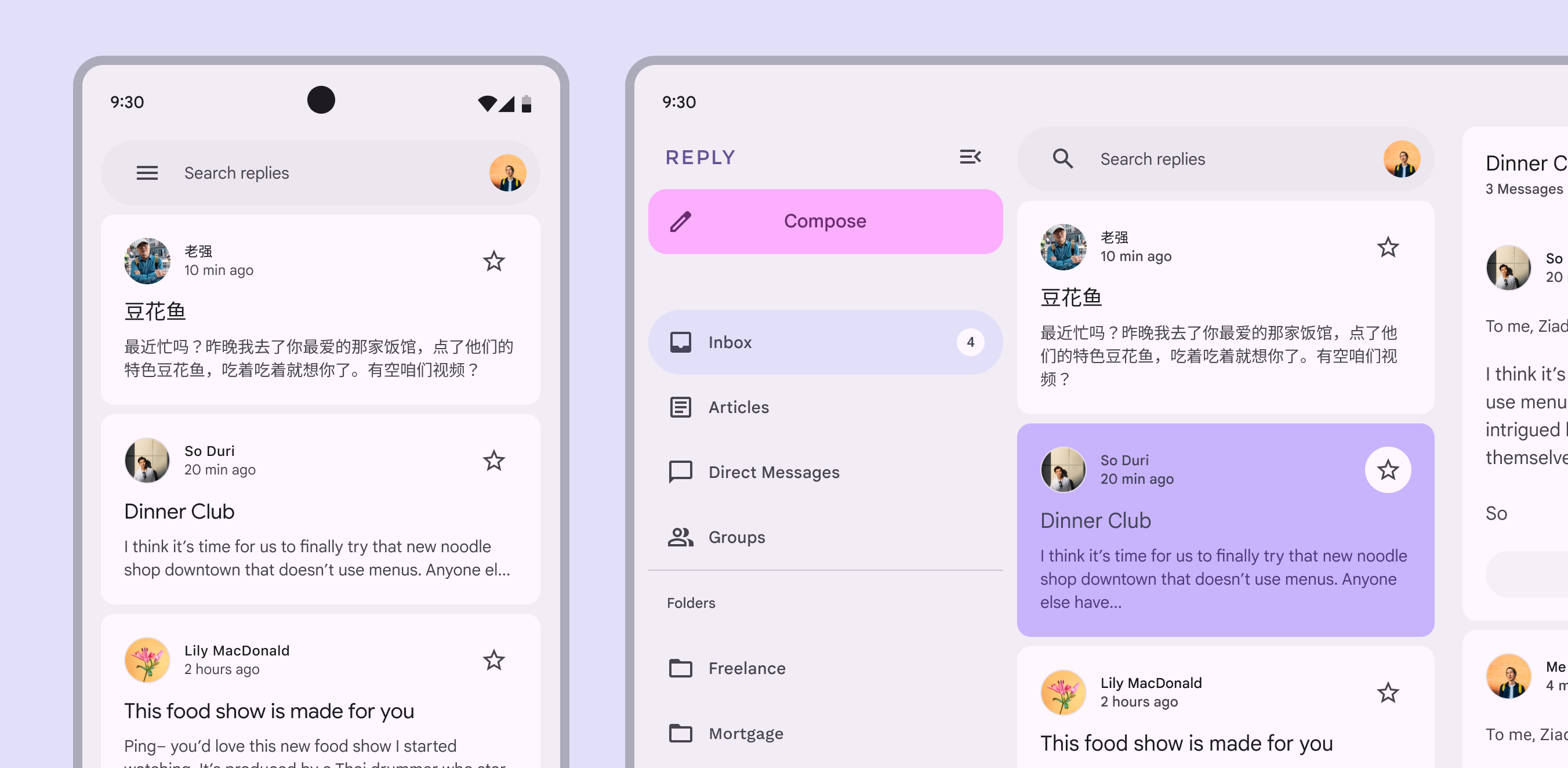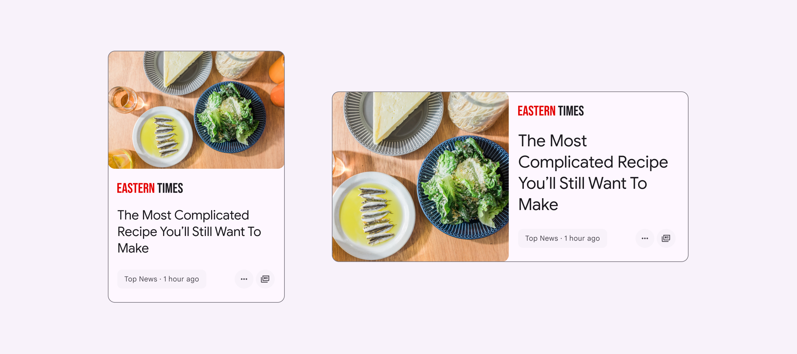 手機上的橫向卡片可在平板上變成更方正的形狀,提高可讀性。文字列表可調整邊距、行距、字型大小,保持 40-60 個字元/行的最佳可讀性。