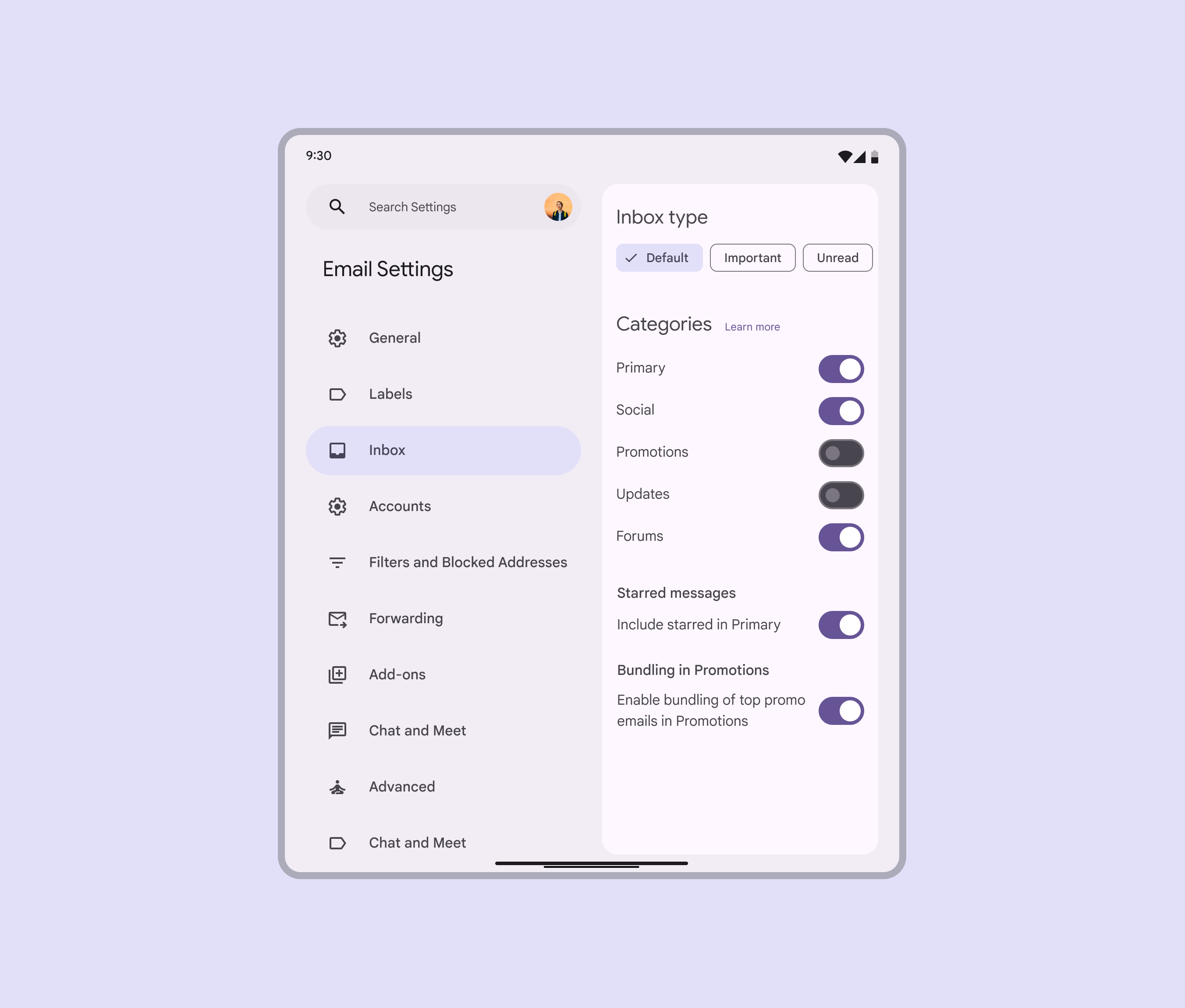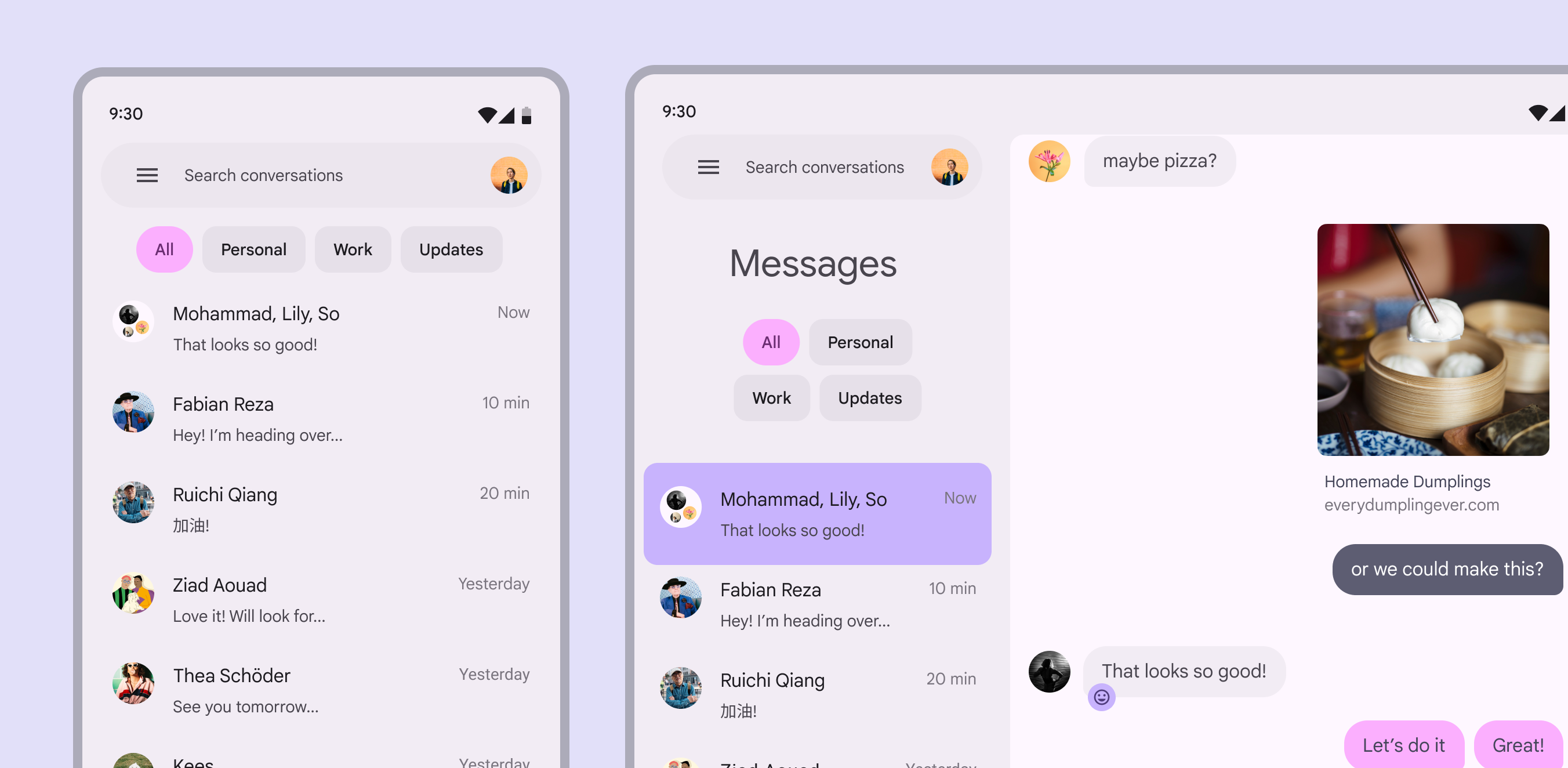 中等視窗(Medium) 可以使用雙窗格佈局,但需注意:複雜列表項可能影響可讀性,導致內容過於緊湊。低密度內容(如設定頁面)更適合雙窗格,便於快速導航。