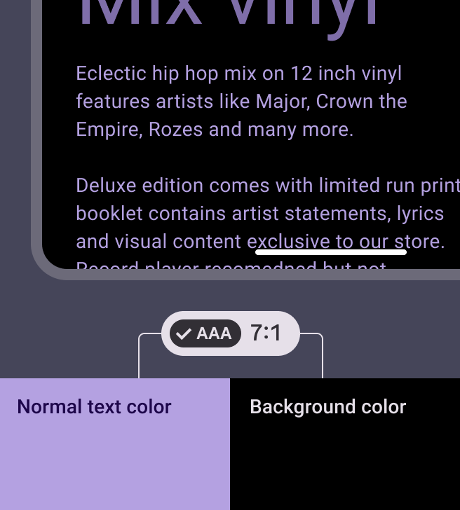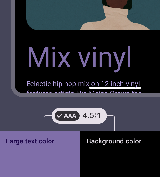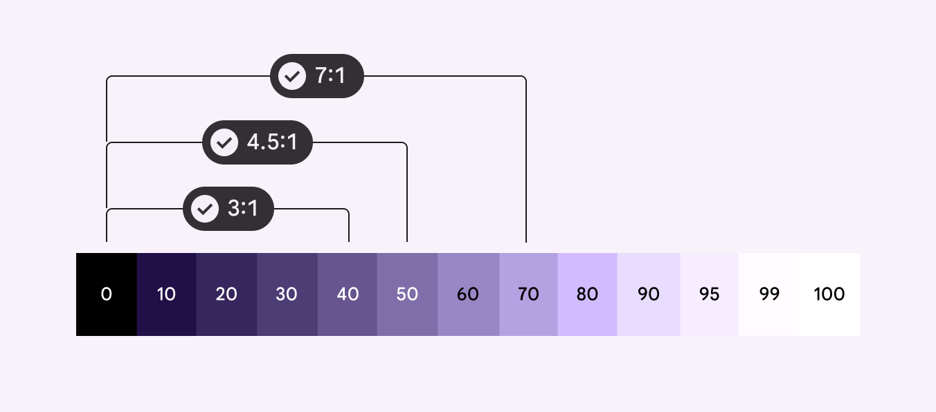 為支援視覺無障礙設計,需選擇適當的文字與背景對比度。對比度指的是顏色的明暗差異,通常用對比度比率來衡量。關鍵對比度比率可以確保可讀性。符合 WCAG(Web 內容無障礙指南)的標準。