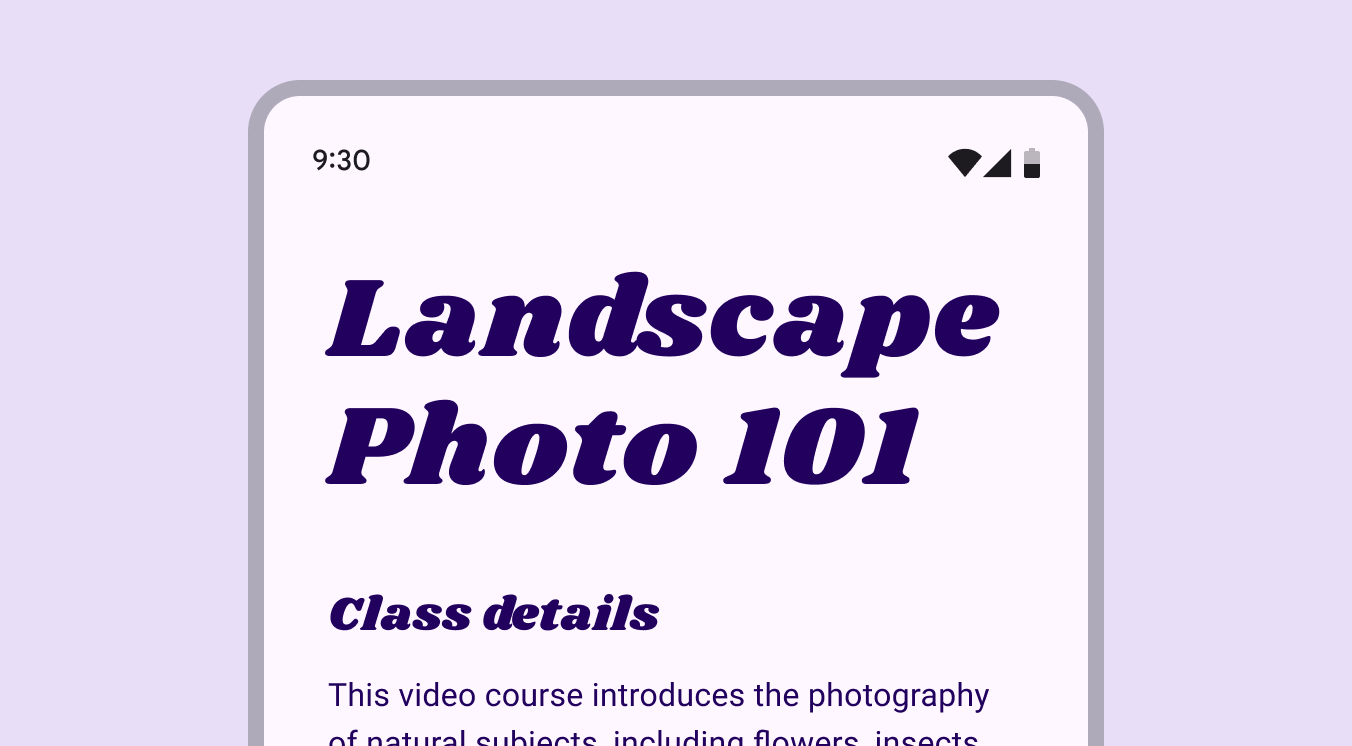 標題適用於小螢幕上的簡短、重要文字,用於突出主要內容。標題可使用富有表現力的字型,但需確保適當的行高和字距以維持可讀性。