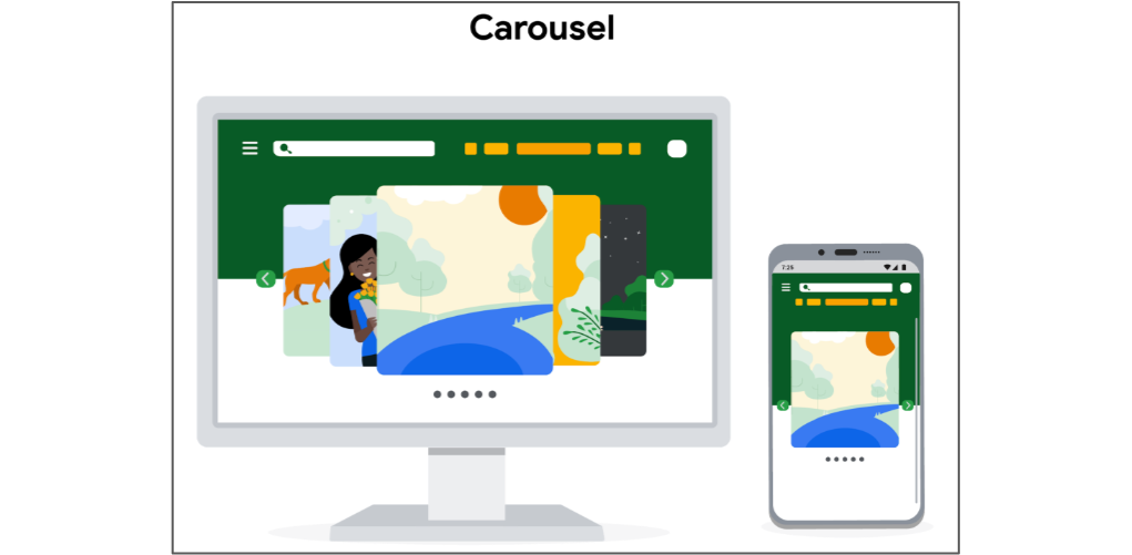 可滑動(點選、滑動或自動播放)的影象或卡片集合。社交媒體、攝影網站、電商平臺等圖片密集型頁面。可將大量內容展示在首屏區域上,提高視覺吸引力。