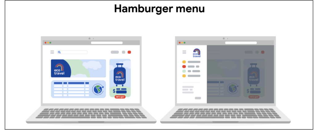 三個水平線條組成的圖示,形似漢堡。點選後展開完整的導航列表,可能從頁面邊緣滑入,或佔據整個螢幕。一般放在網頁左上角。移動端常用,適合隱藏大量導航連結,使主頁面保持整潔。