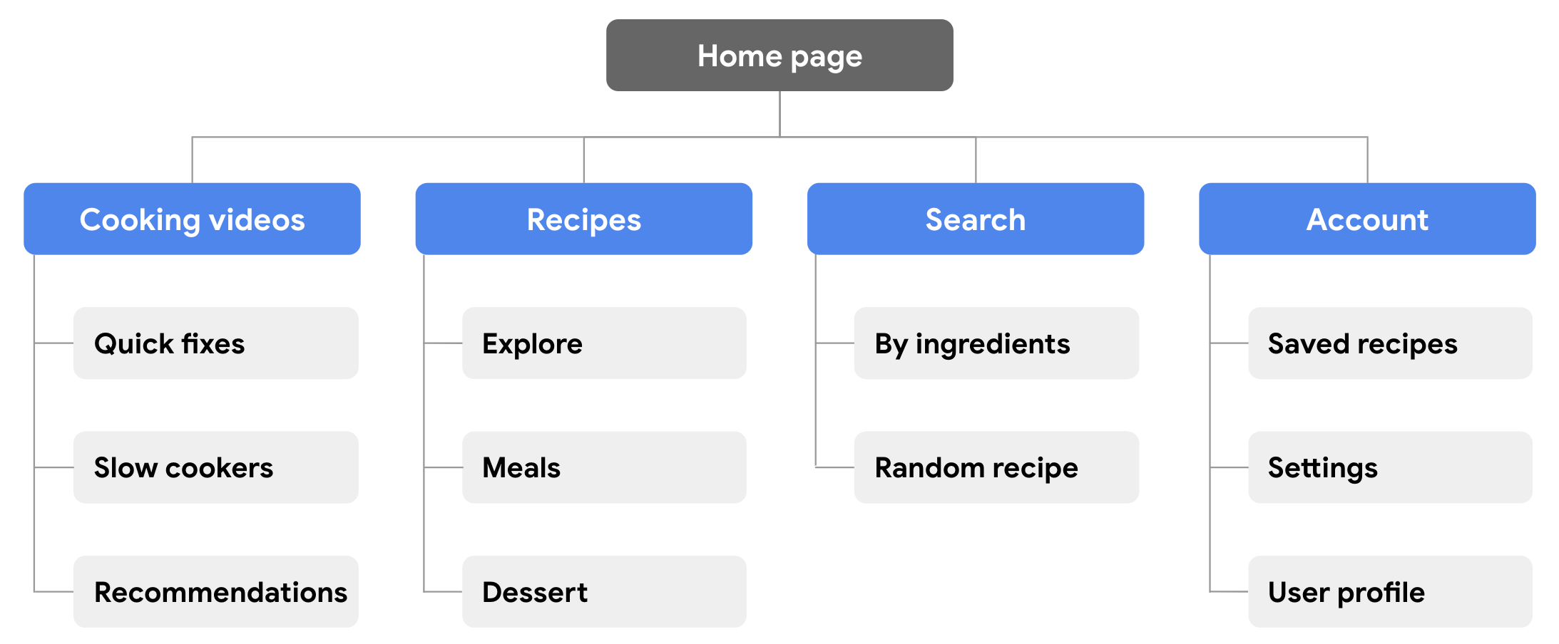 大多數小型網站使用層級結構,因為它清晰、易於使用者導航。例如烹飪網站,從首頁開始分出不同主類頁面,是非常合理的設計。