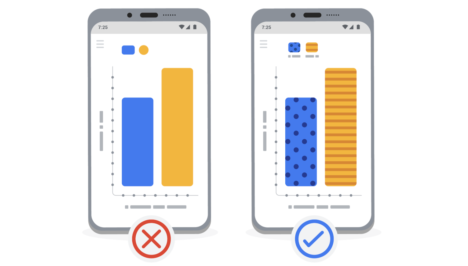 想象你在製作使用者研究圖表,可以用條紋或點狀圖案區別顏色相近的圖形,以便所有使用者清晰區分。