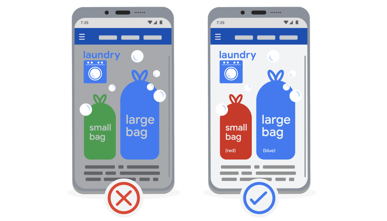例如以下組合對色盲使用者來說辨識困難:並不是說不能使用這些顏色,而是避免將它們並排使用,特別是在表示關鍵資訊時。同時,可新增標籤、圖示等其他提示來增強區分度。