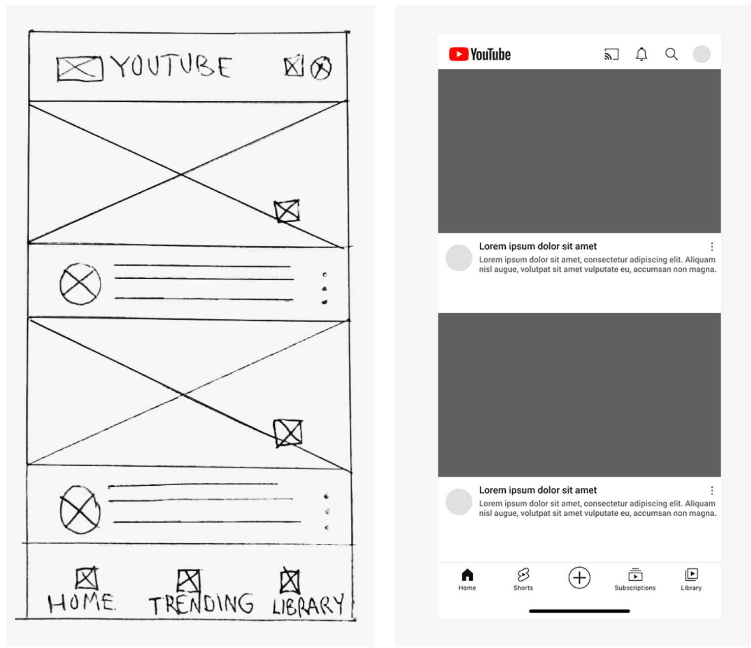 設計師透過觀察 YouTube 的首頁,手繪了一個線框圖。這個方法叫作 倒推設計(reverse engineering),是新手練習線框圖非常常見且有效的方法。