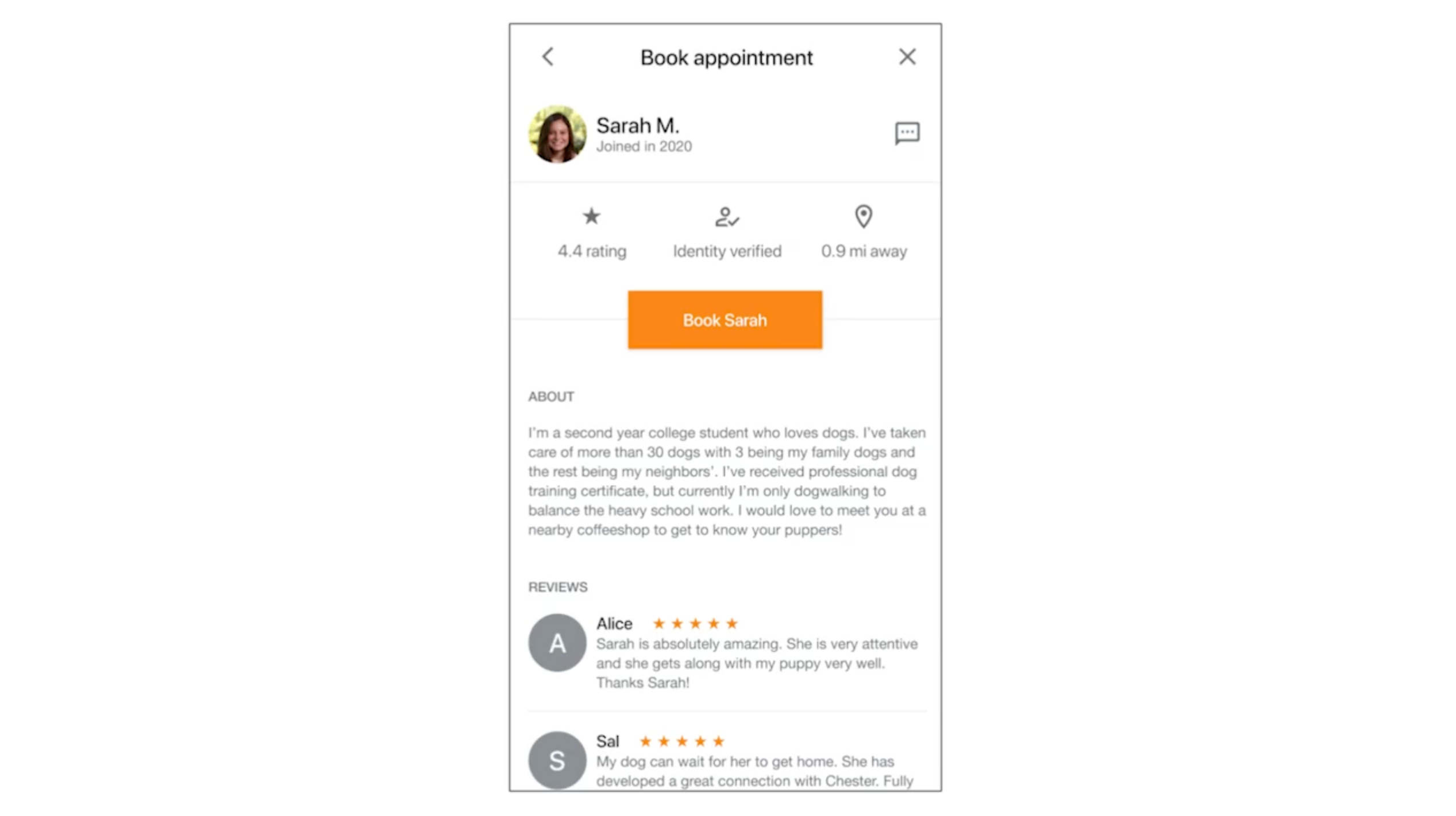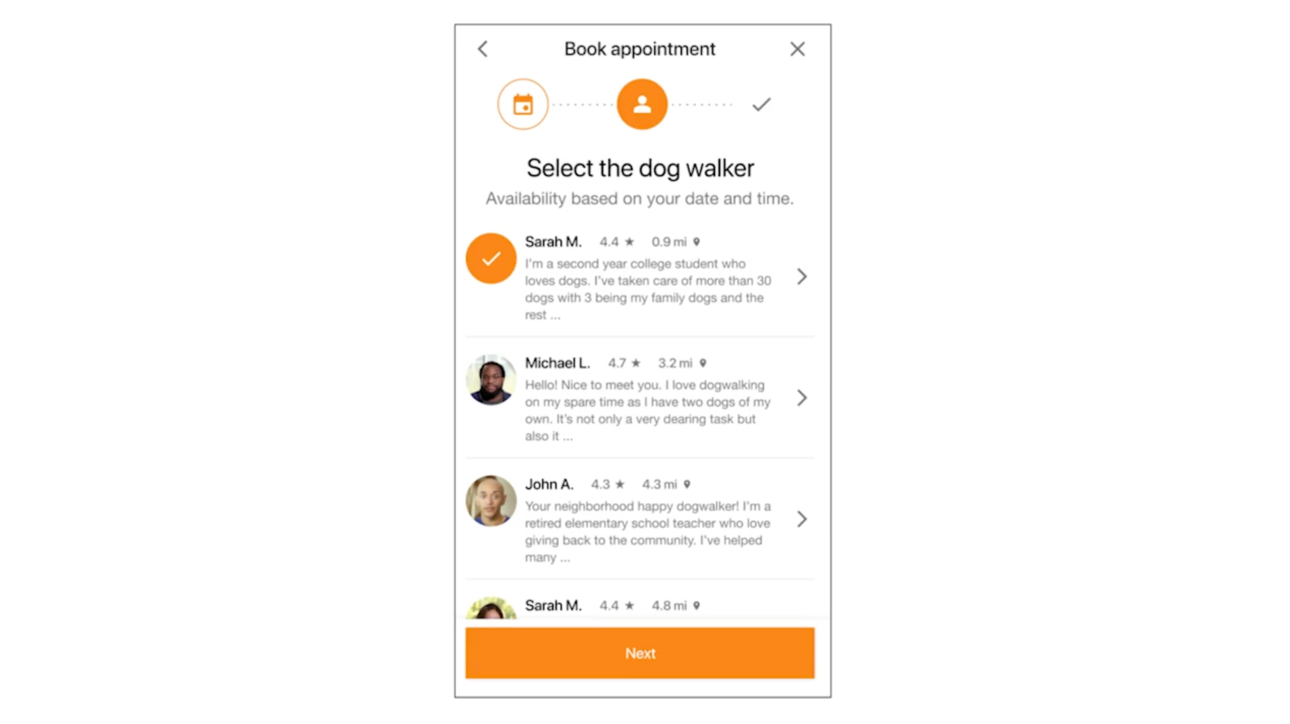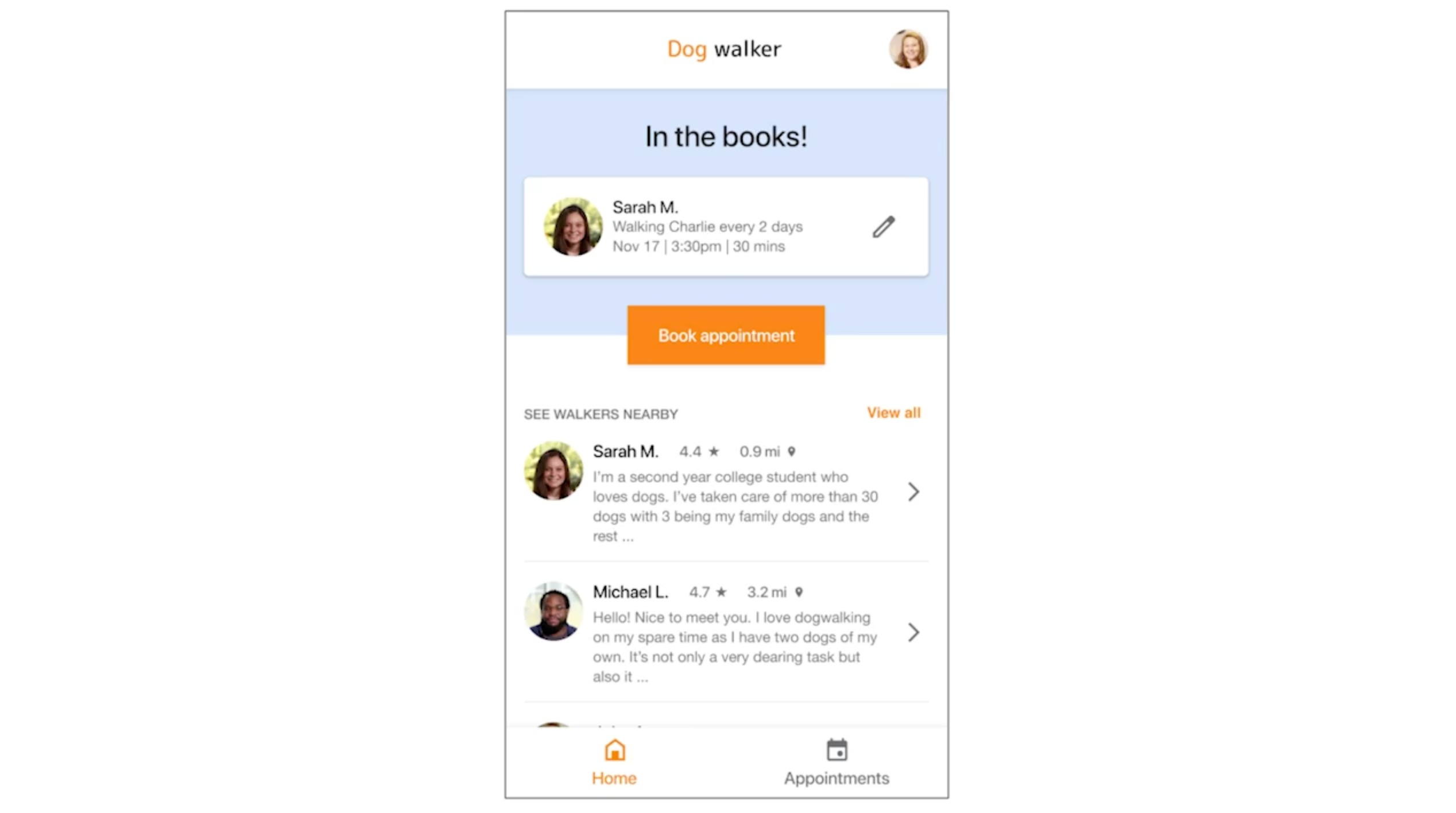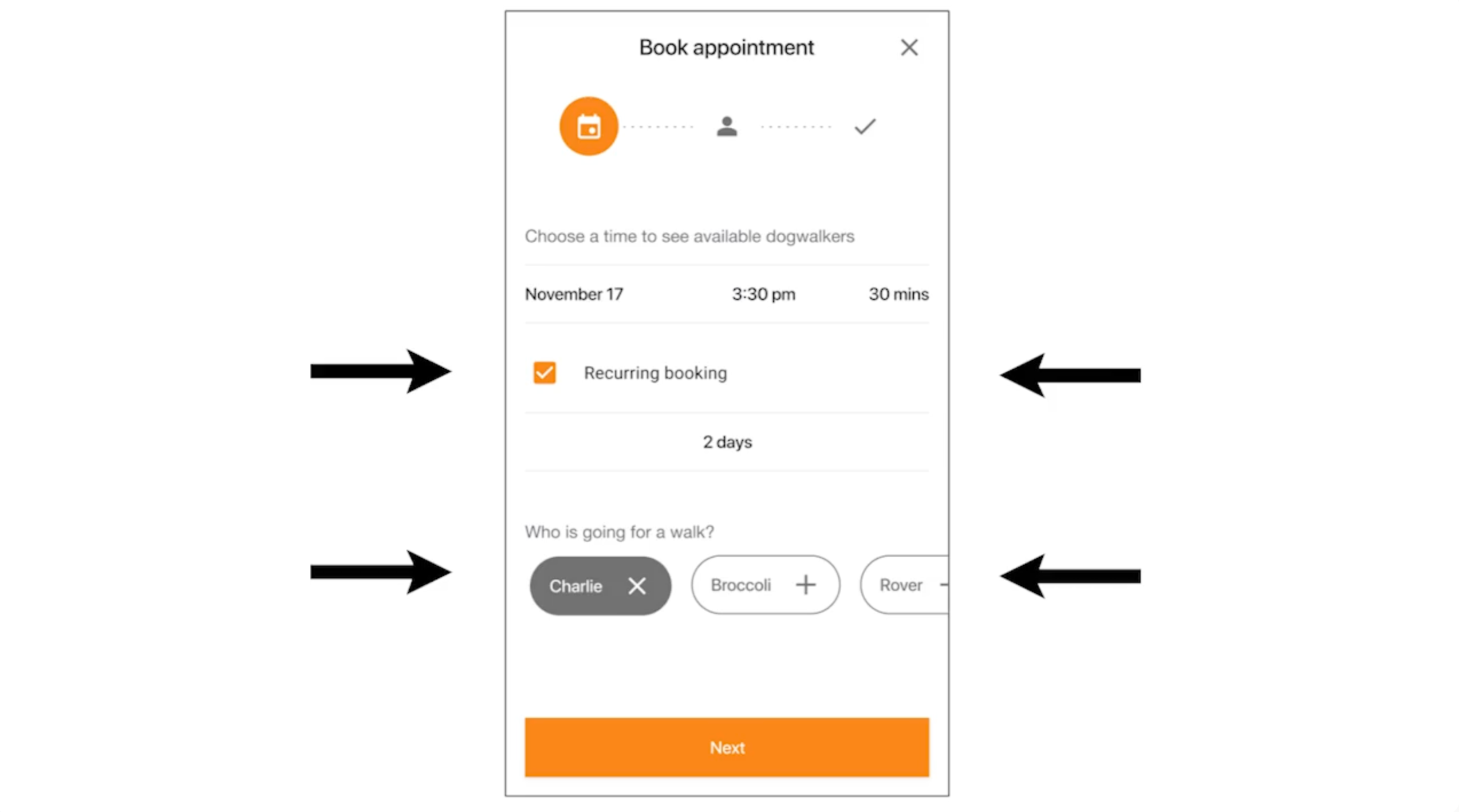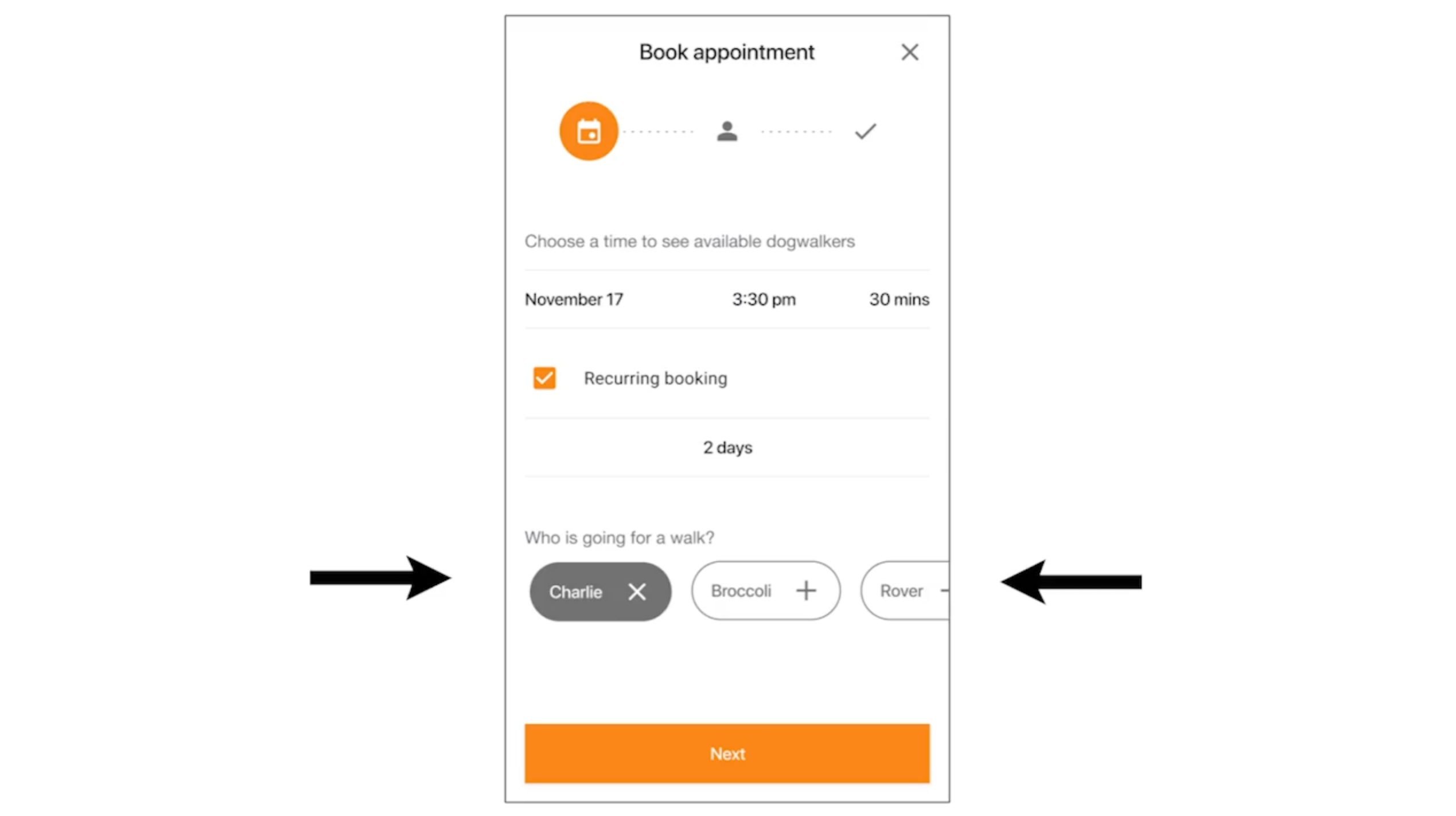 應用:在使用者預約遛狗服務時,狗狗名字(Charlie、Broccoli、Rover)放在橫向緊湊的列表中,使用者會知道這些是一個組。