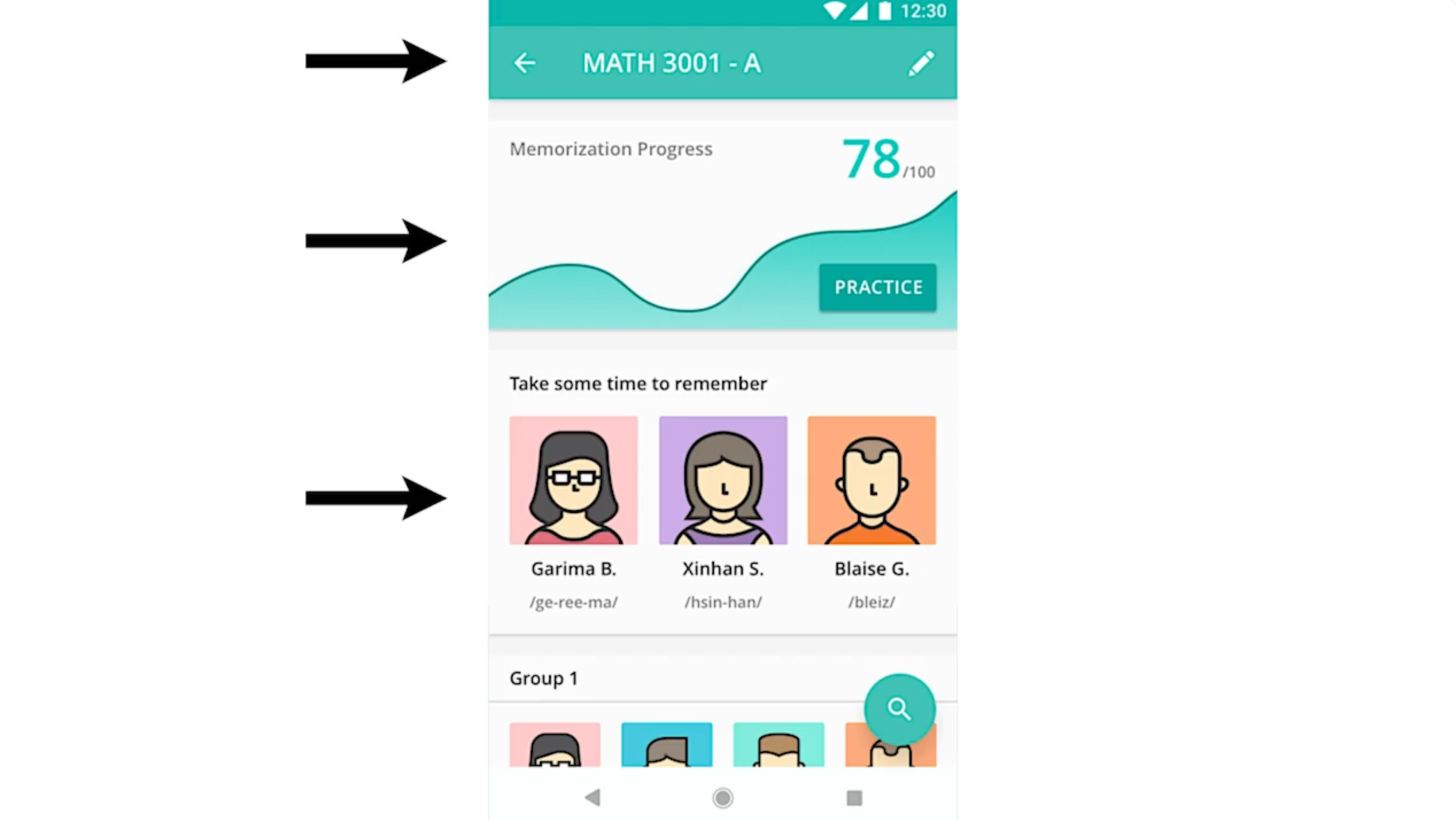 應用:Google UX 設計師 Kaiwei 設計的 Rostery app 將頁面分為三個視覺區域(導航欄、記憶進度圖、學生名單),並用邊框明確劃分割槽域,讓使用者自然將其視為不同功能塊。