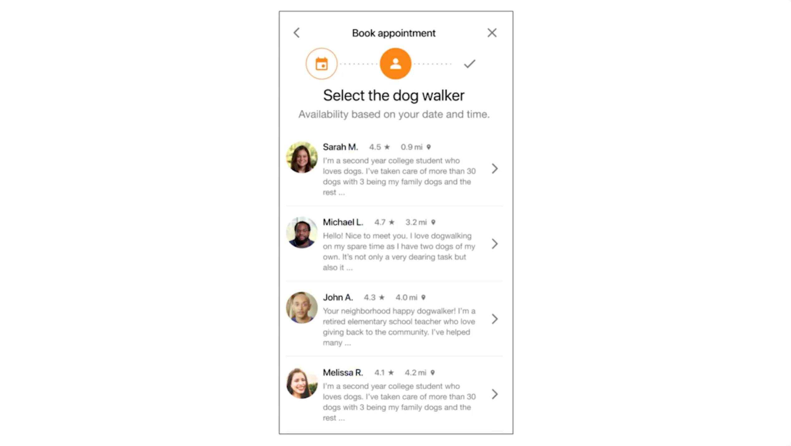 - 每位遛狗員的名字加粗、深色處理,其他資訊如評價、時間等較淺且字型更小
