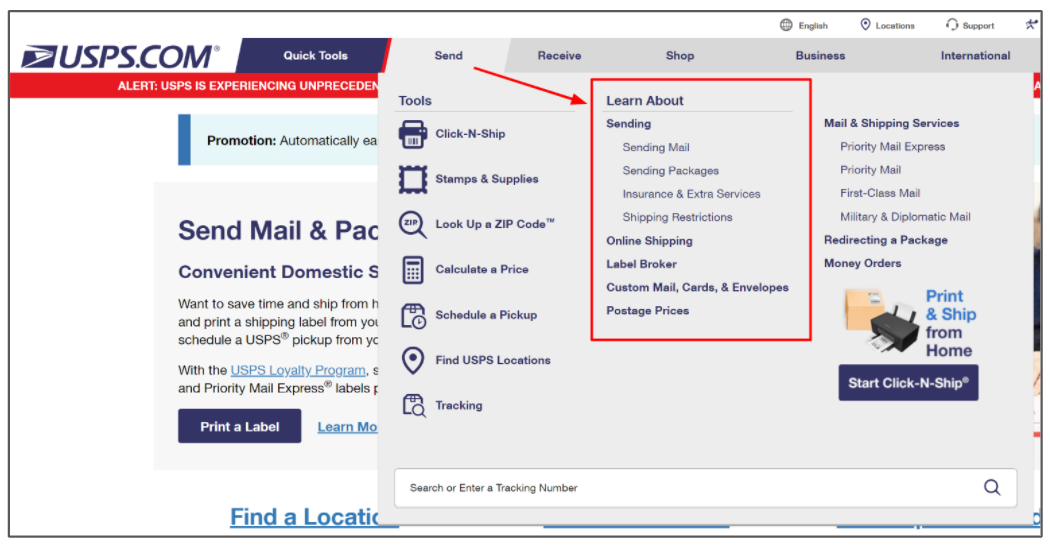 USPS 網站的導航選單:使用者點選 “Send” 後,視線會自然向下移動到 “Learn About” 和 “Sending” 子目錄,完成一次三級導航路徑的無意識掃描。