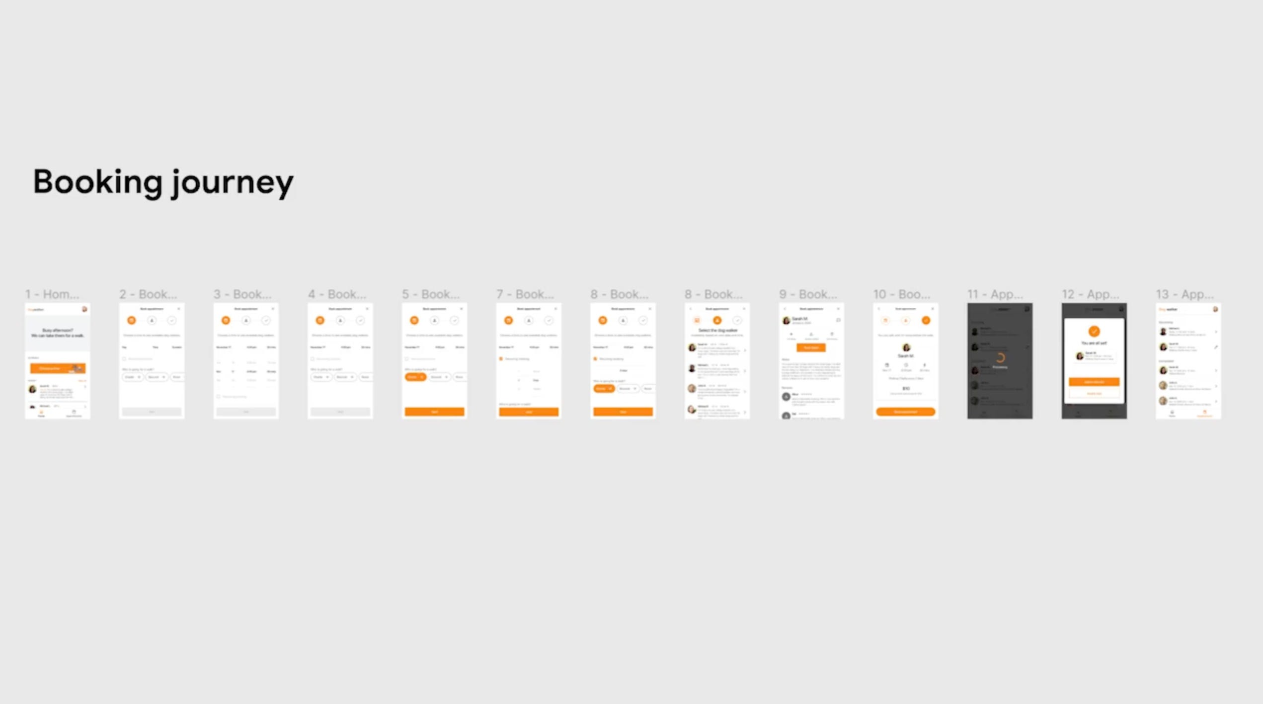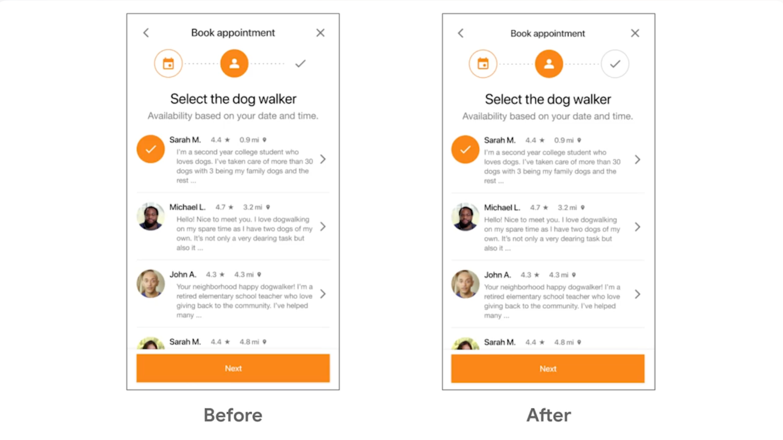 示例:在 dog walker app 中,設計師發現有一個圖示誤用了 #f18530,而其他地方都使用了 #fa7b17。這是細節不一致的典型案例。