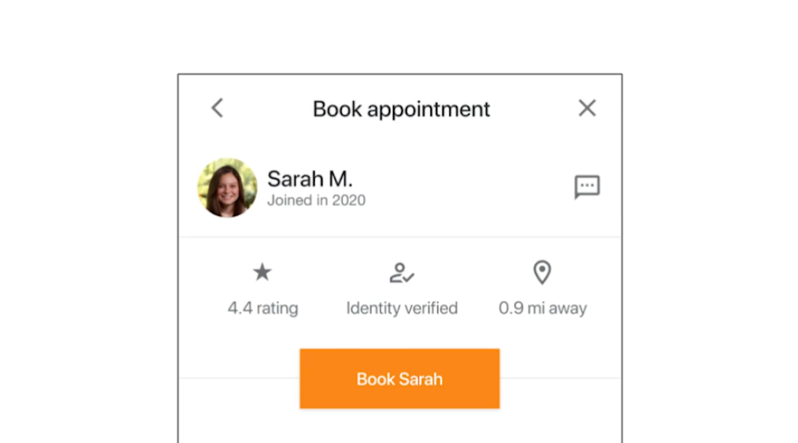 示例:在預約頁中,檢查是否包括“返回箭頭”、“X 關閉圖示”以及“Book Sarah”按鈕,確保每一步使用者都能順利操作。