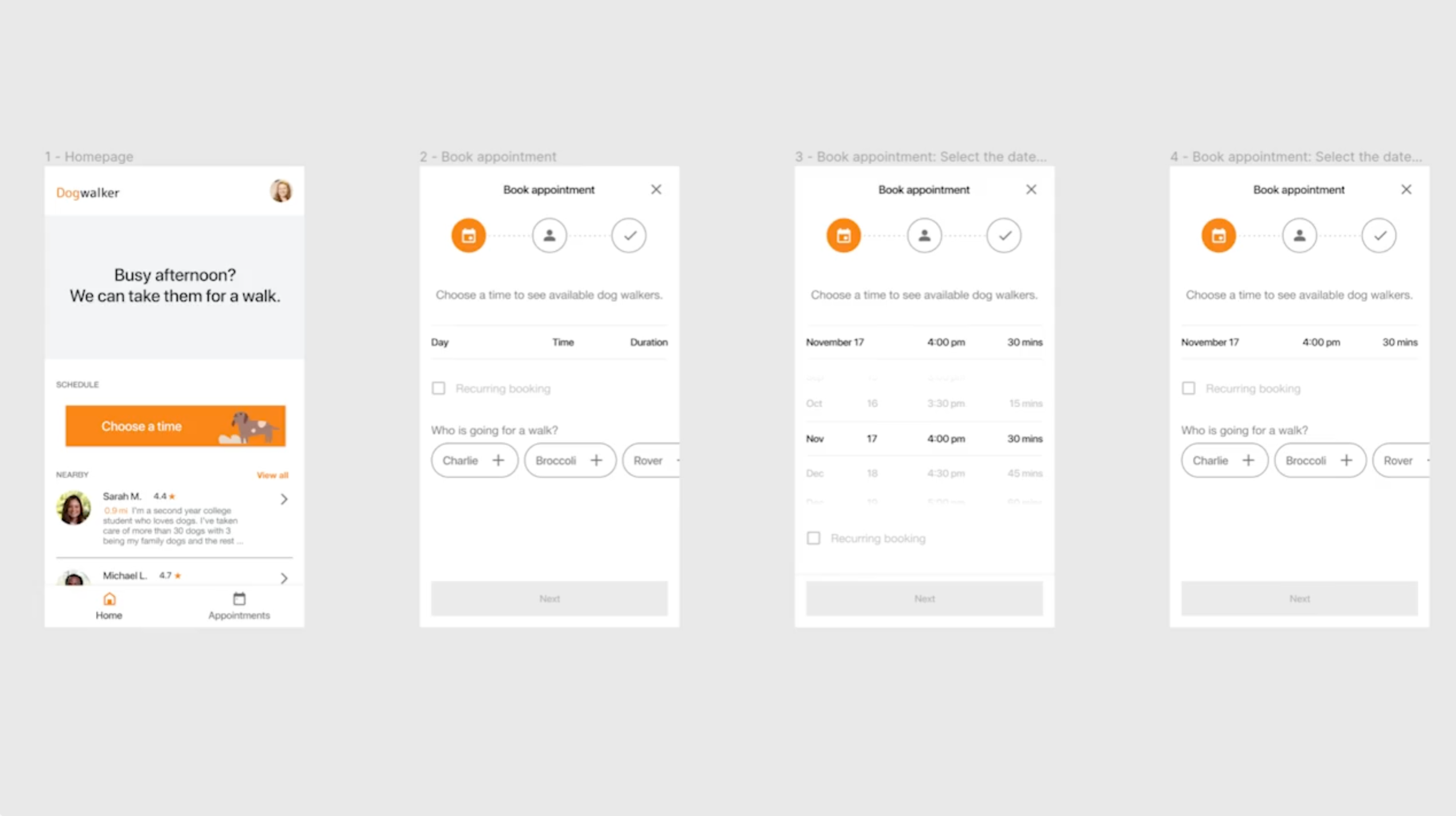 示例:最初,“預約頁面”中的狗狗介紹文字向右縮排,導致頁面不平衡。後來改為左對齊,同時給“選擇”對勾加了灰色圓圈來加強視覺平衡。