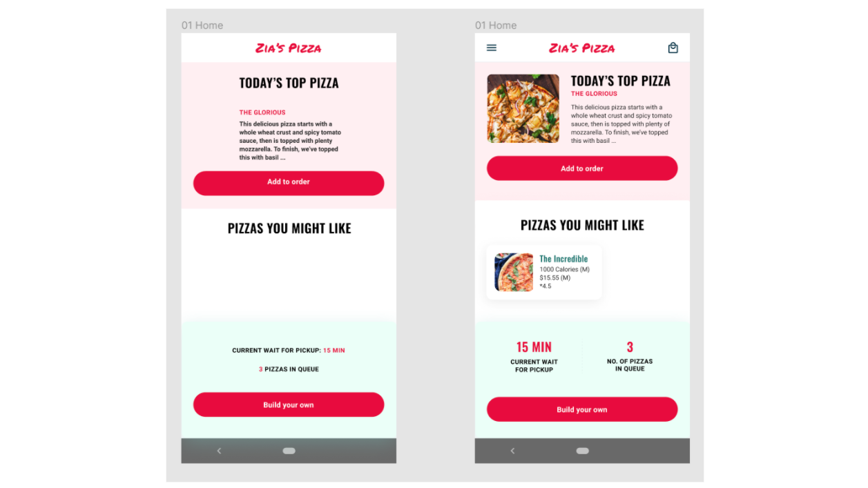 目的:突出使用者最需要注意的元素,增強視覺權重。示例:將“你可能喜歡的披薩”區域放進一個帶陰影的框中,並新增圖片,幫助使用者理解資訊歸屬並引導點選。