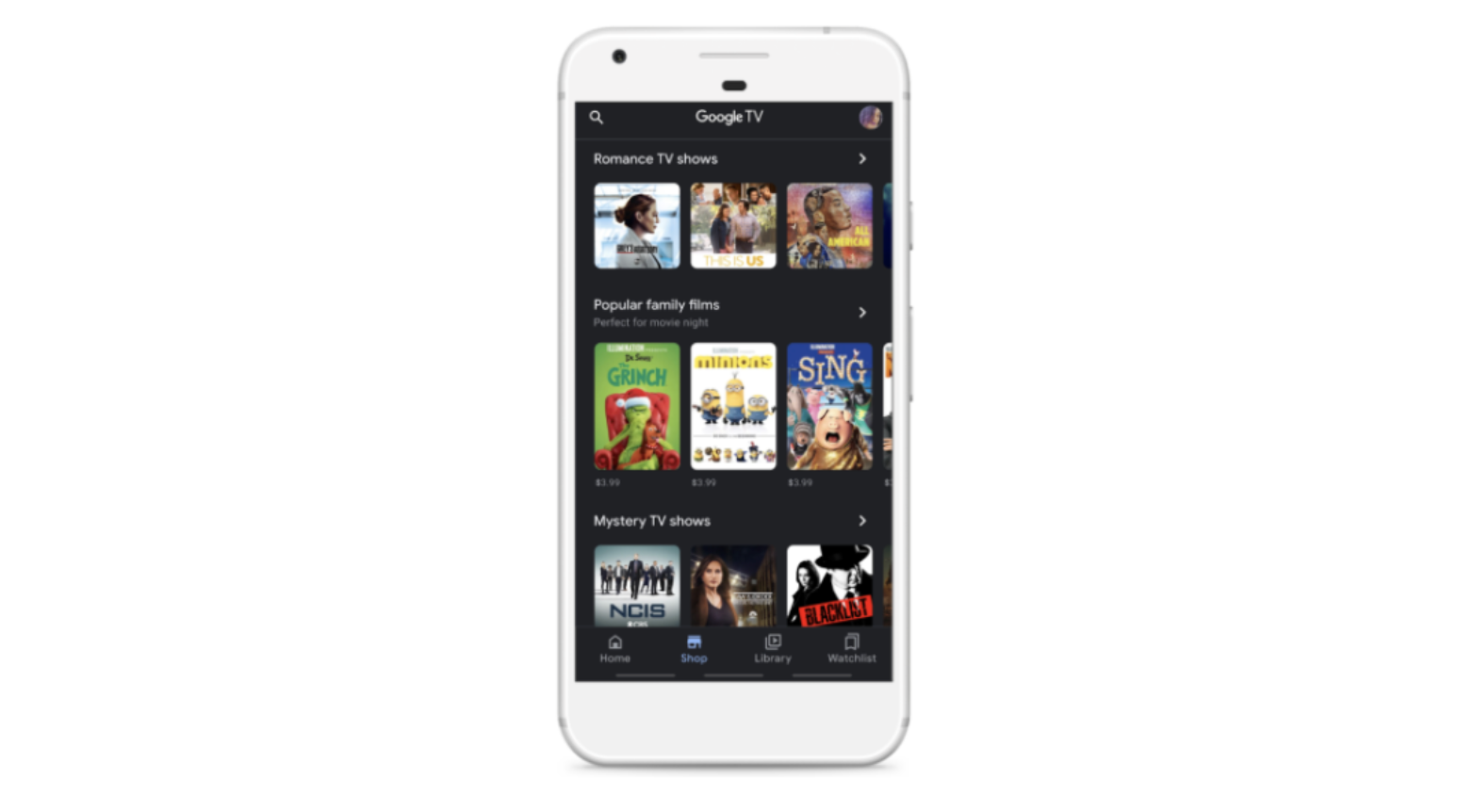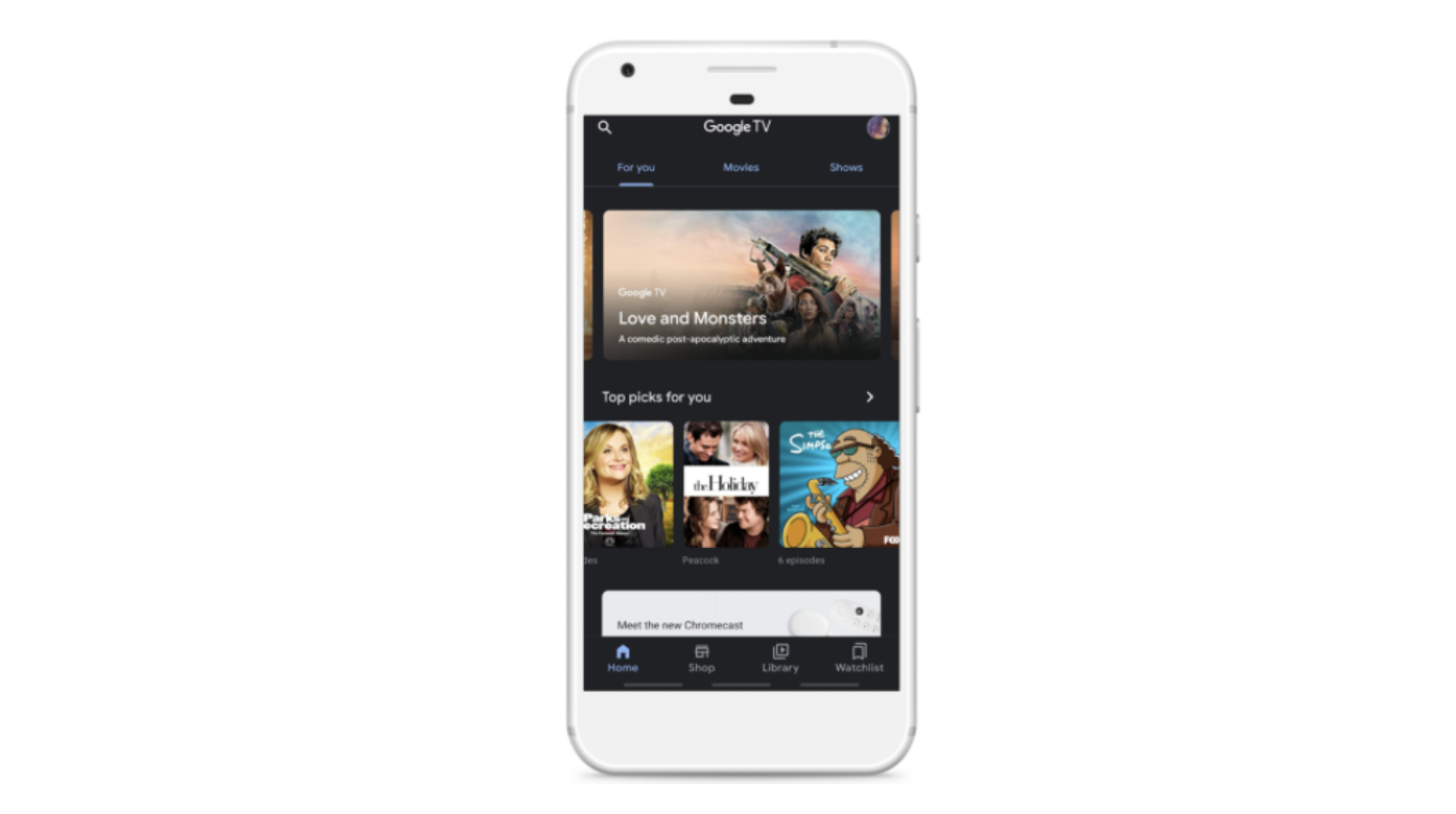 在 Google TV 應用中,頂部推薦影片(如《Love and Monsters》)的縮圖比其他影片大,吸引使用者注意。