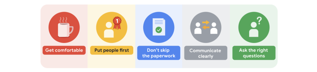 在第一次做可用性研究之前,掌握這五個重要方法,能讓你的研究更順利,得到更好的使用者反饋。這五個方法是:讓參與者放鬆(Get comfortable)、尊重每個人(Put people first)、準備好必要檔案(Don't skip the paperwork)、說話要清楚(Communicate clearly)、問對問題(Ask the right questions)。