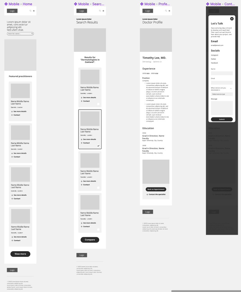 使用者從首頁開始,查詢並最終聯絡一位醫療專業人員,流程清晰且完整。