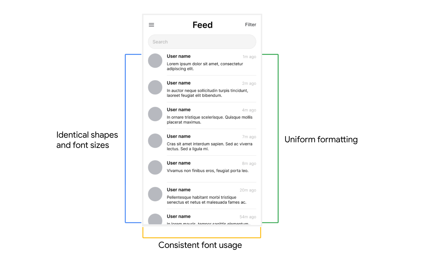 如果你在頁面中使用多個頭像、卡片或按鈕,它們應該在大小、形狀上保持一致。