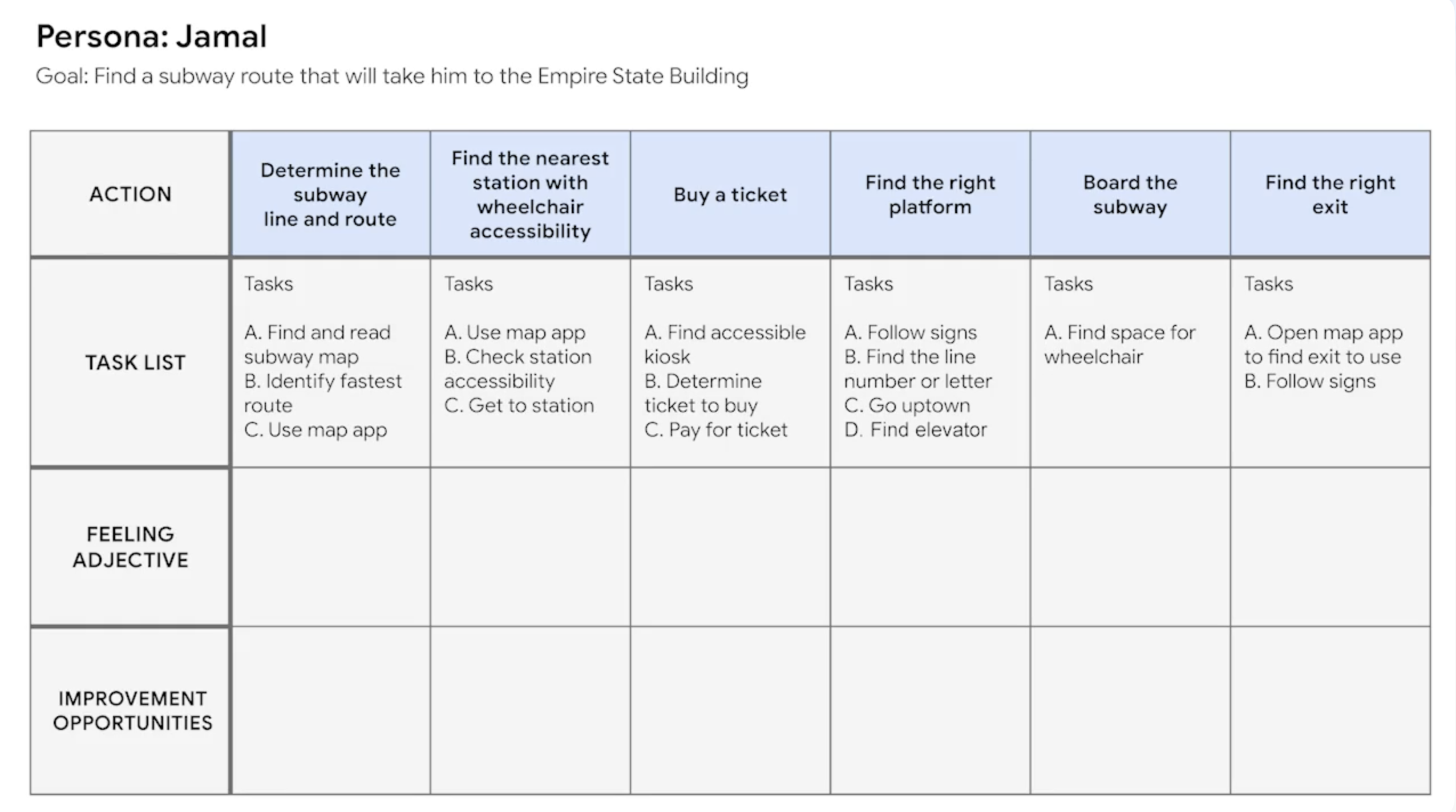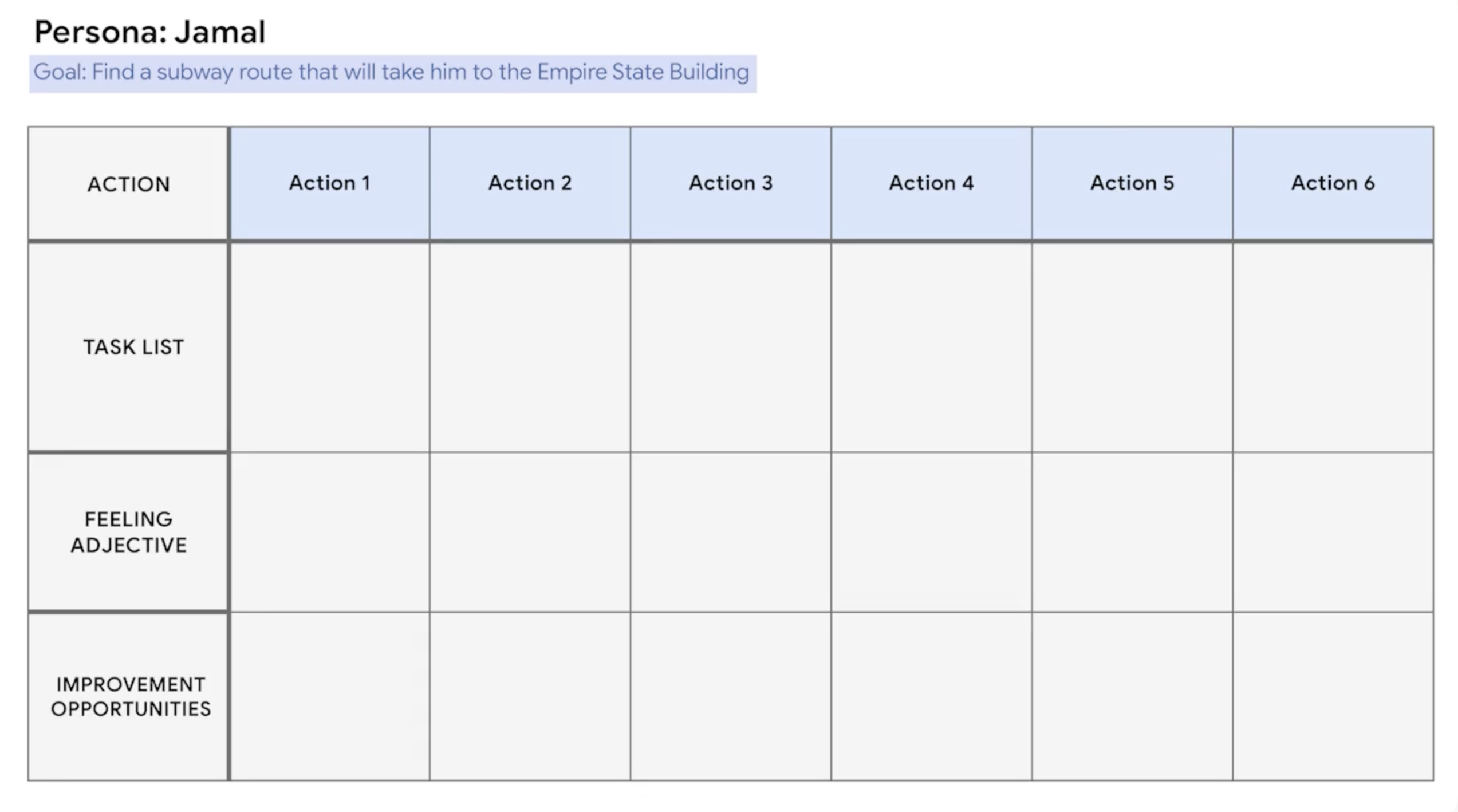 - 使用者旅程地圖是一種圖表,用來展示使用者完成目標時的各個步驟和體驗。