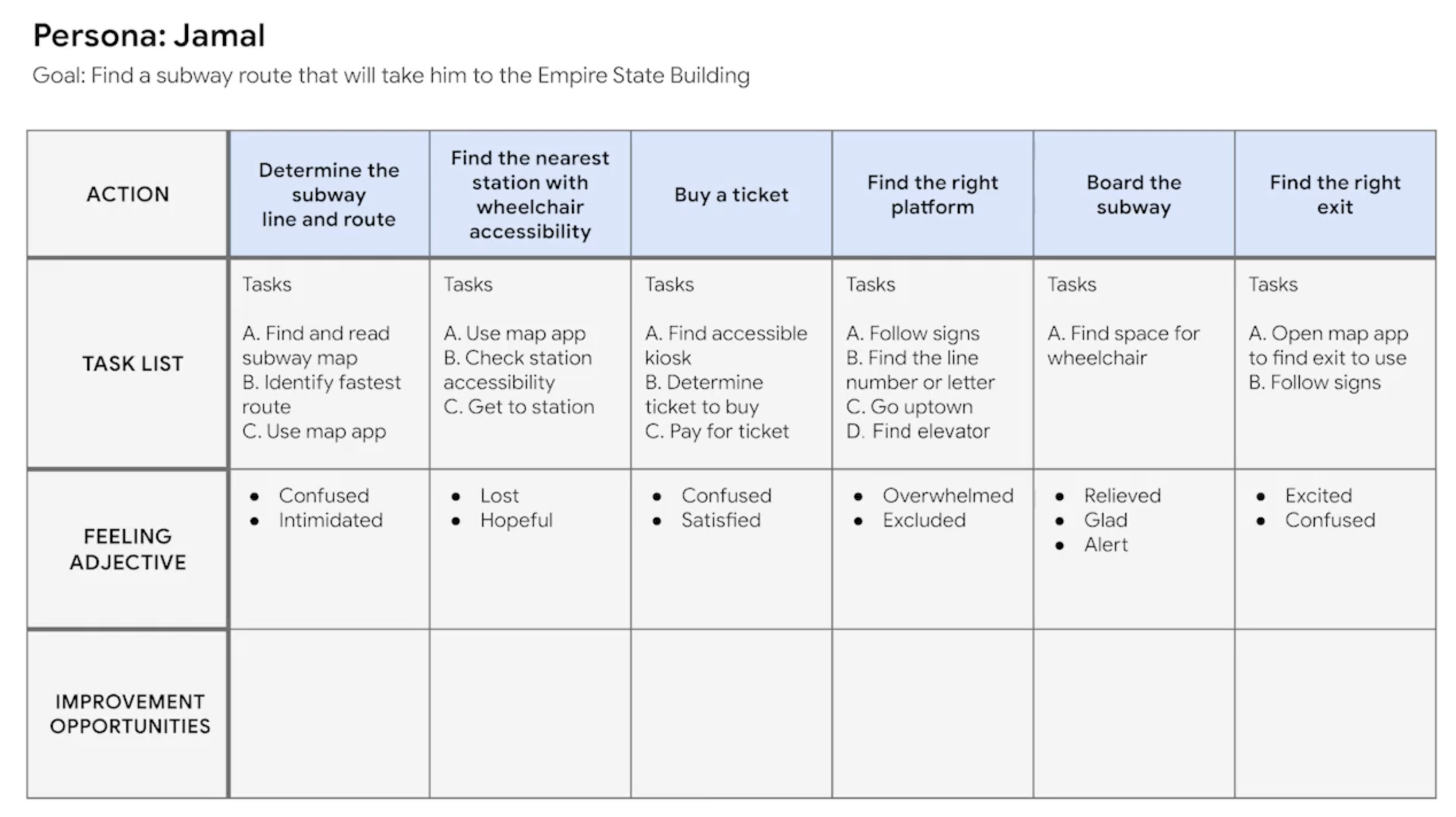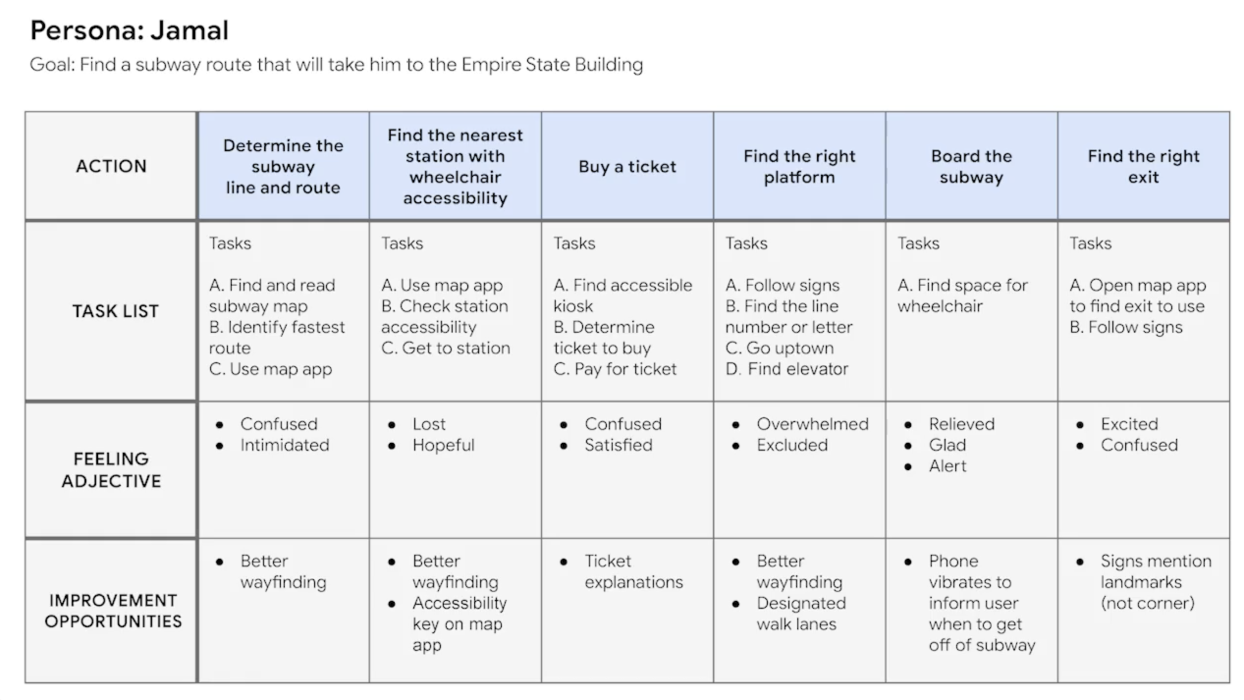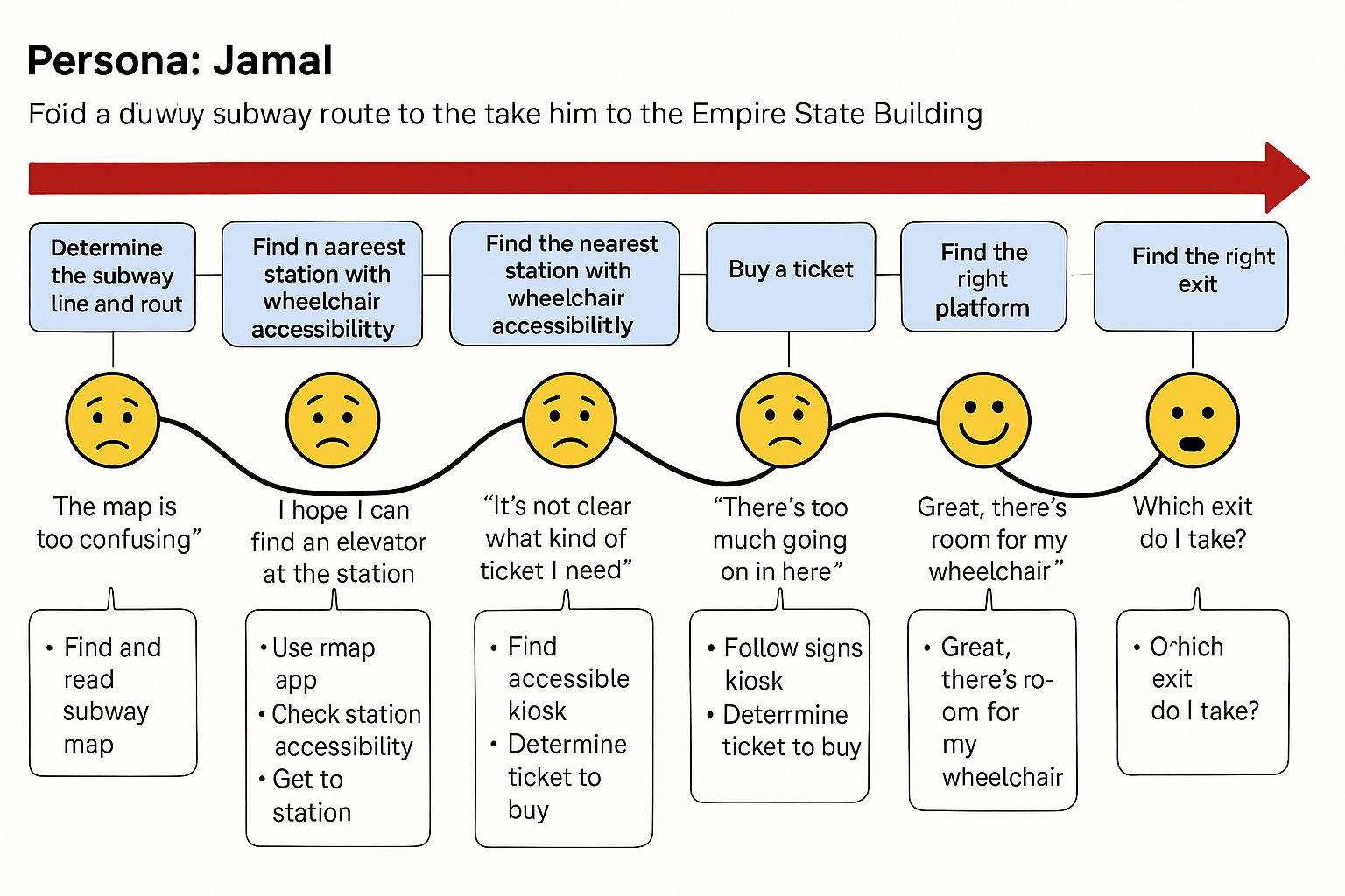 透過觀察Jamal的旅程和感受,設計師可以提出改進:在地鐵圖上加"無障礙標識",幫輪椅使用者快速找到合適入口。這不僅幫助了Jamal,也讓整個系統更好用、更公平。