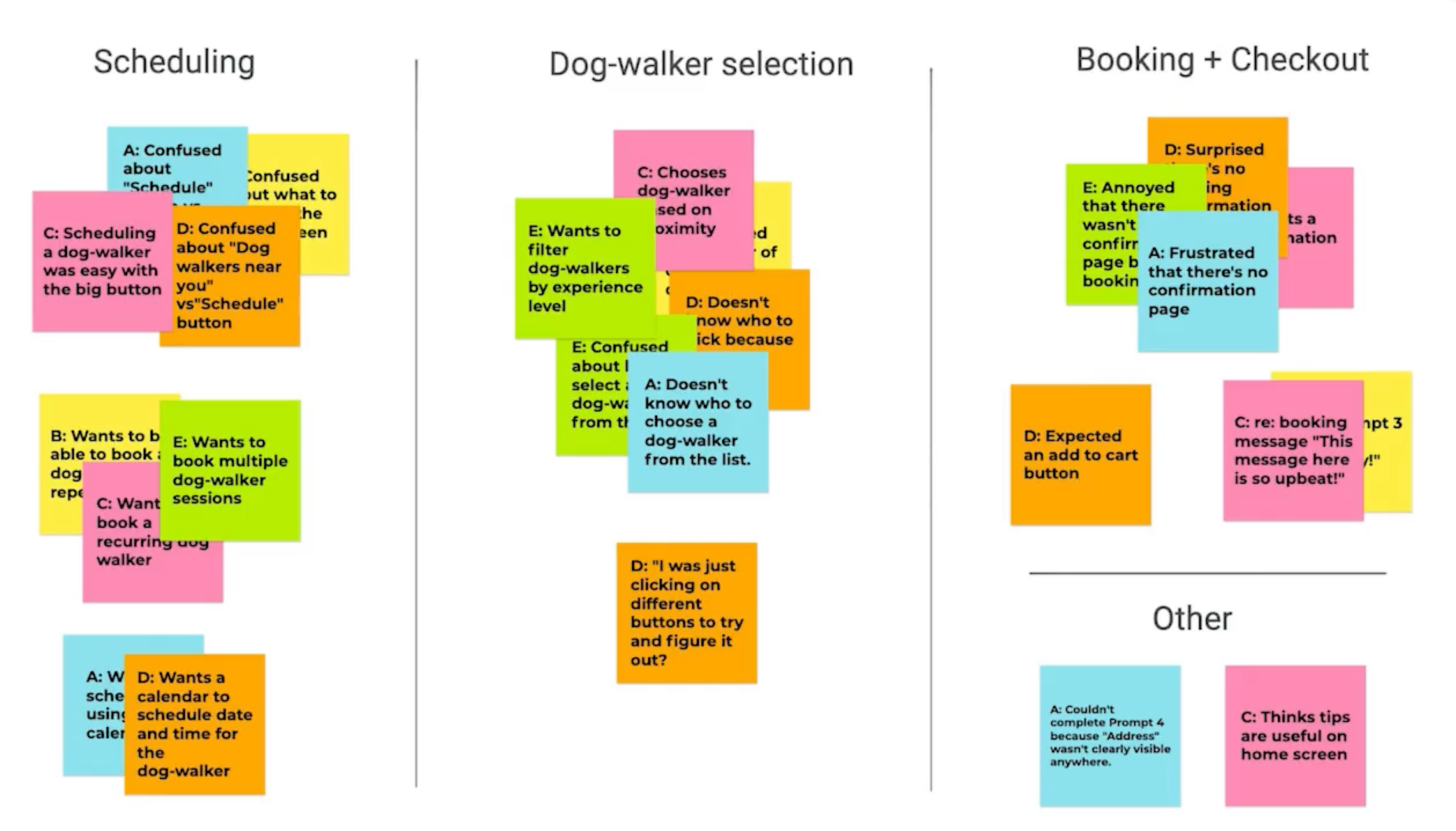 - 3張便利貼都提到"想重複預約同一個遛狗員"或"一次預約多個時間"。
