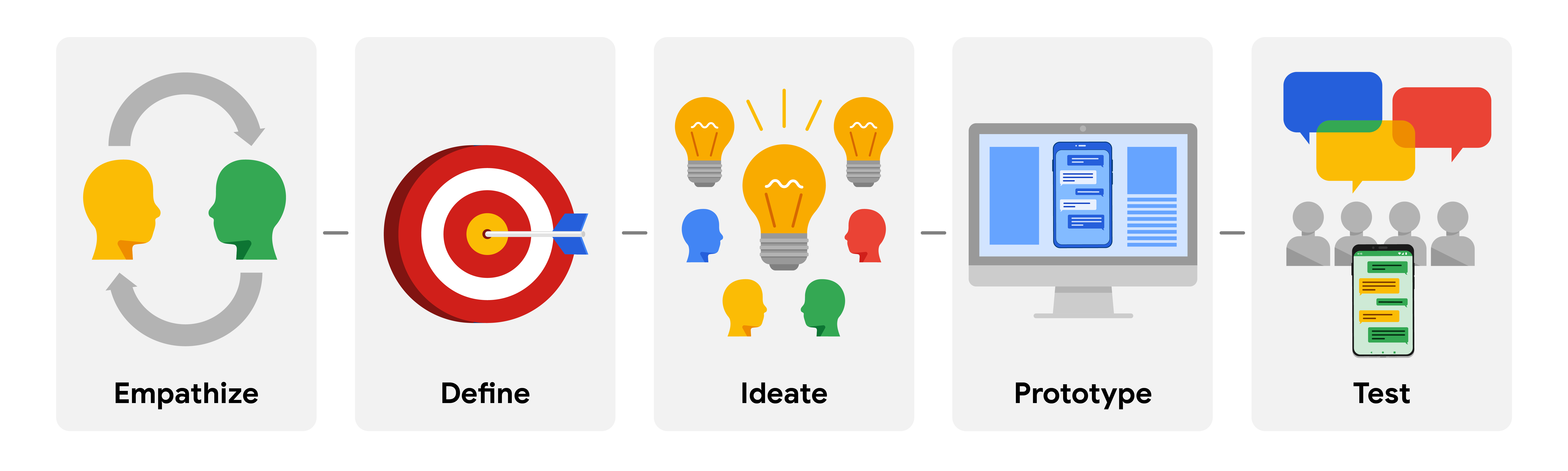 設計思維不是直線前進,而是迴圈改進的過程。在任何階段,都可能因使用者反饋而回到前面的步驟(比如重新研究或想新點子)