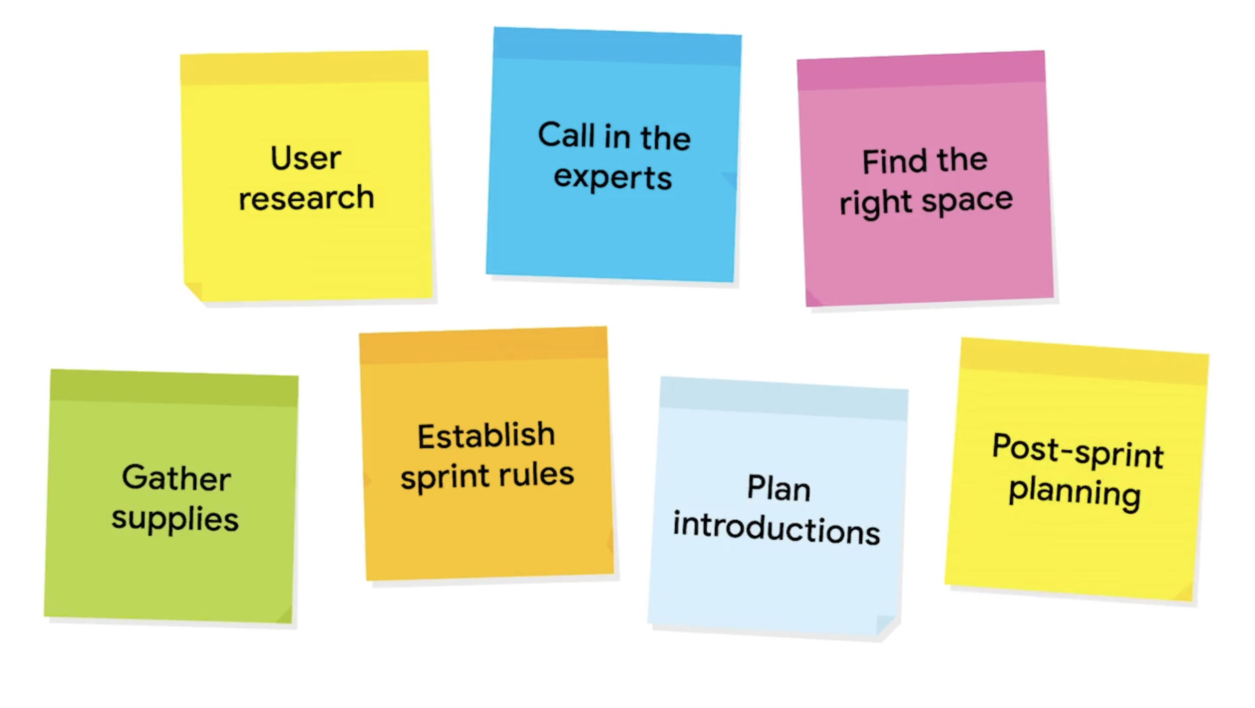 設計衝刺常常有來自不同部門的人,他們可能互不認識。透過簡單的自我介紹和小遊戲可以建立信任和合作氛圍。推薦的破冰活動:讓大家分享自己向客服投訴的經歷。這能讓大家關注"使用者視角",正是解決設計問題的起點。