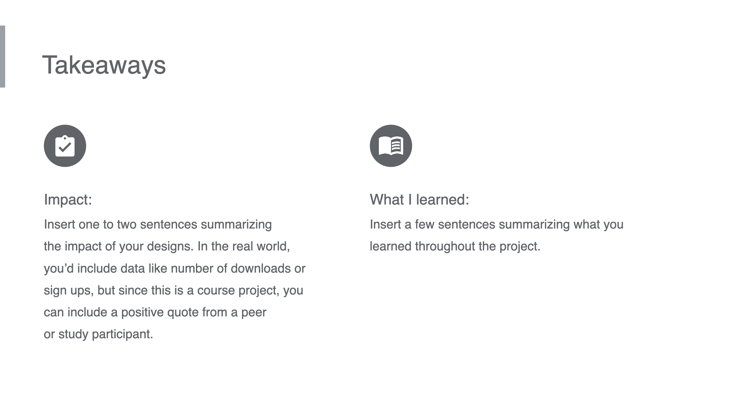 影響:寫一到兩句話,總結你的設計產生的影響。在真實專案中,你可能會用下載量或註冊使用者數等資料來說明。但如果這是一個課程專案,你也可以引用一位同伴或研究參與者的積極反饋。