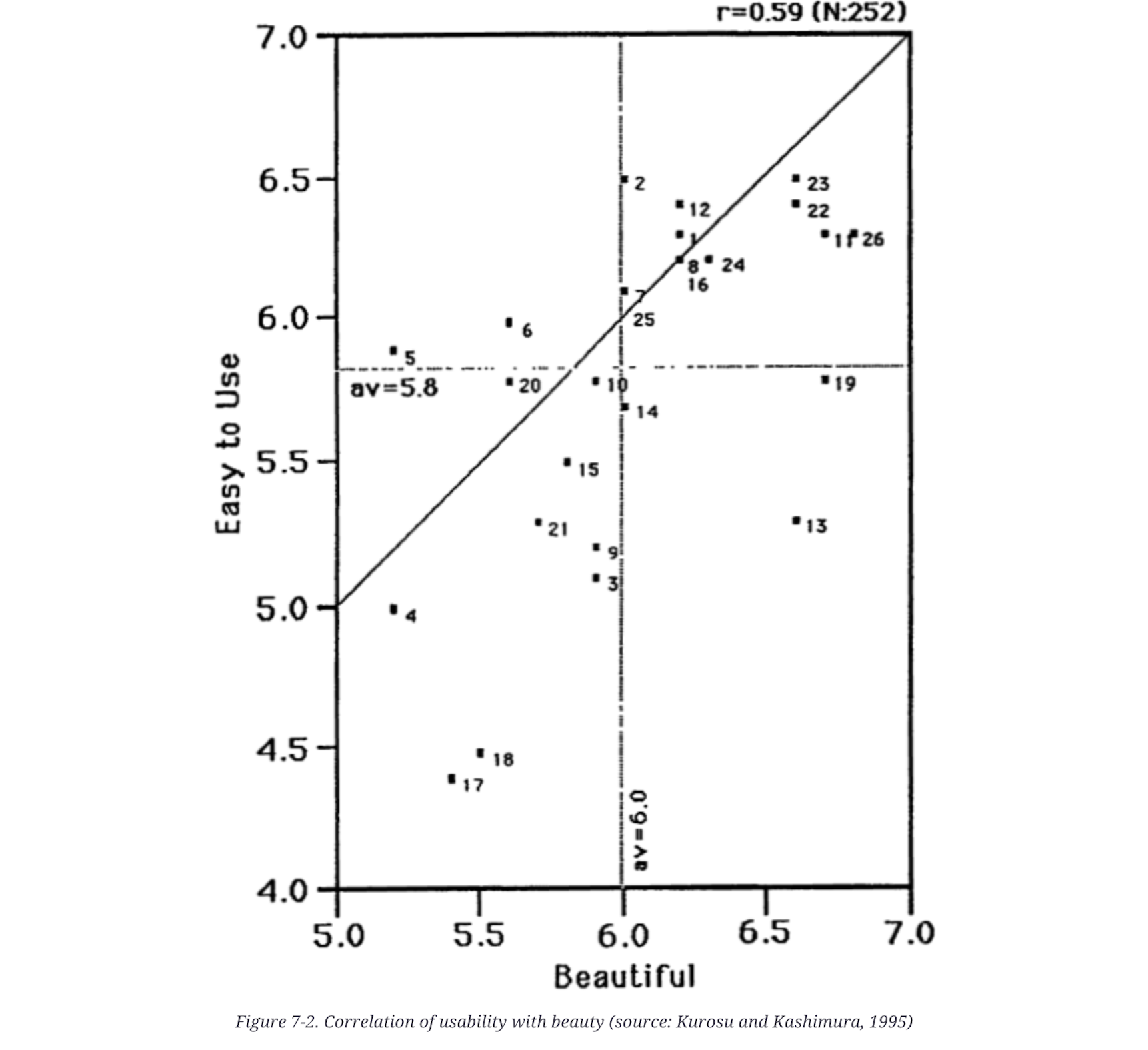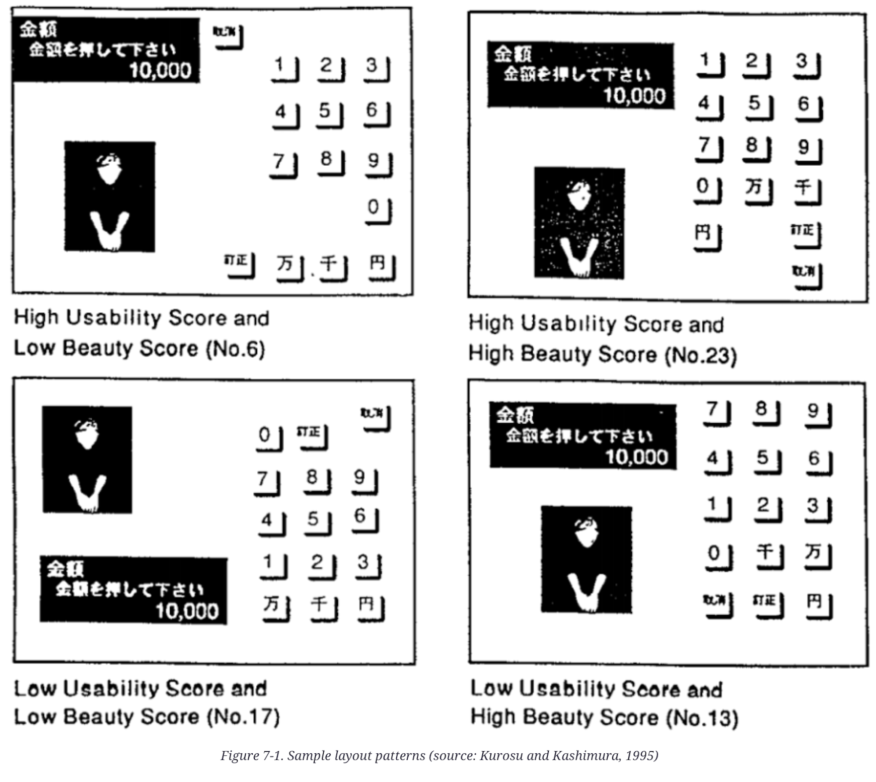 1995 年日立公司的兩位研究員(Masaaki Kurosu 和 Kaori Kashimura )做了一個實驗:研究人員測試了 26 種 ATM 介面佈局,請 252 位參與者從功能性和美觀性兩個維度對每個設計進行 10 分制評分。結果發現: