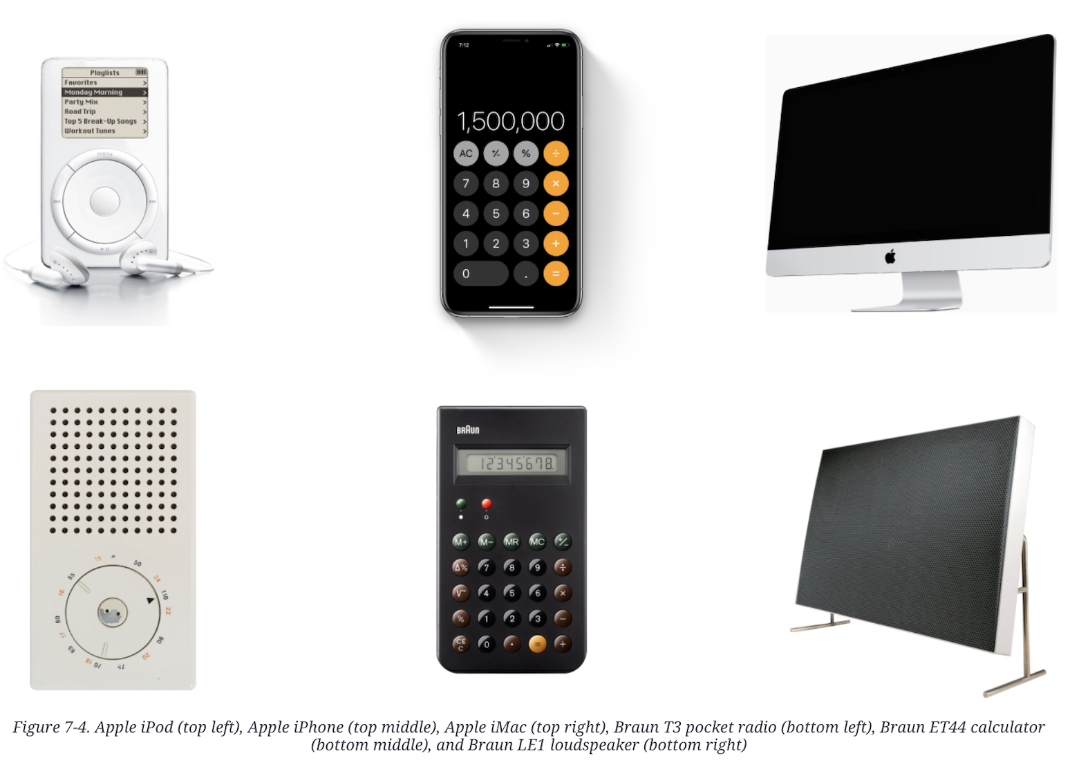 Apple延續了Braun的功能性極簡主義與精緻美感。iPod、iPhone和iMac等產品明顯受Braun影響,既保持簡約優雅的設計,又注重易用性。